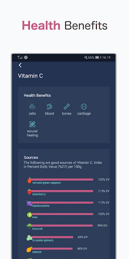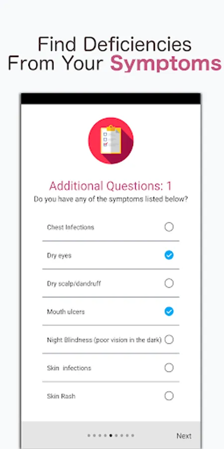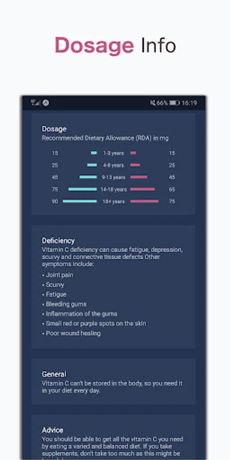 - Diagnosis tool that can check any health symptoms that you might have against known symptoms of vitamin deficiency.