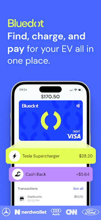 BLUEDOT Visa® DEBIT CARD**: Specialized for EV enthusiasts, save up to $135 monthly on EV and daily expenses. Compatible with major EV brands and charging networks, including ChargePoint, EVgo, Blink charging and Electrify America.