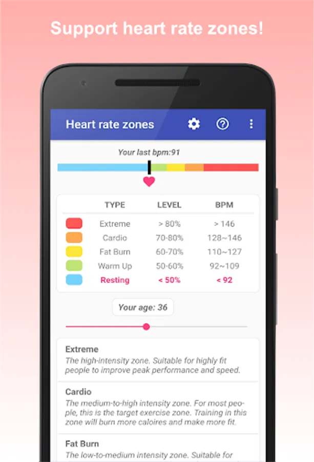 2. Support 5 heart rate zones (i.e., extreme/peak, cardio, fat burn, warm up, resting)