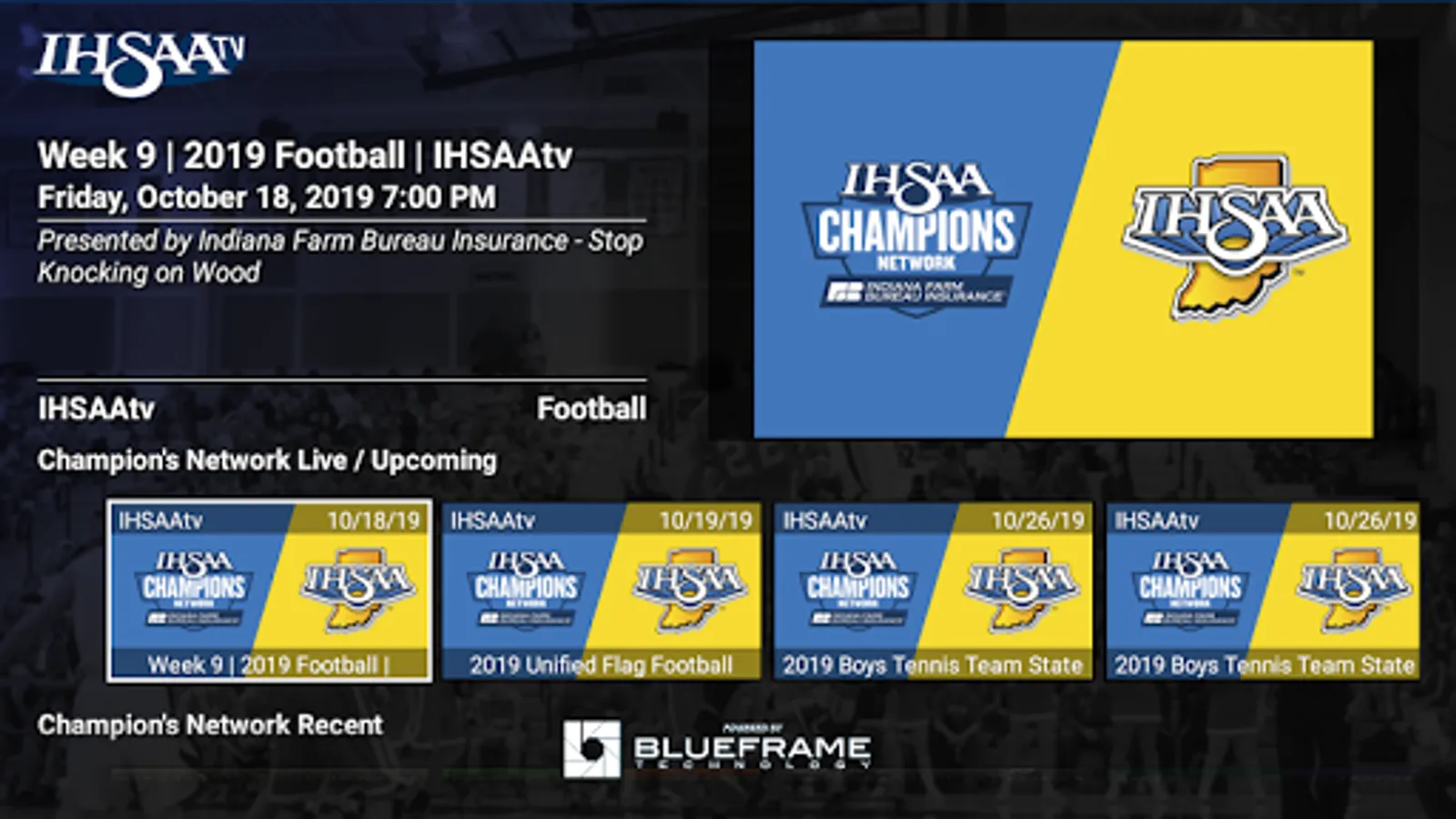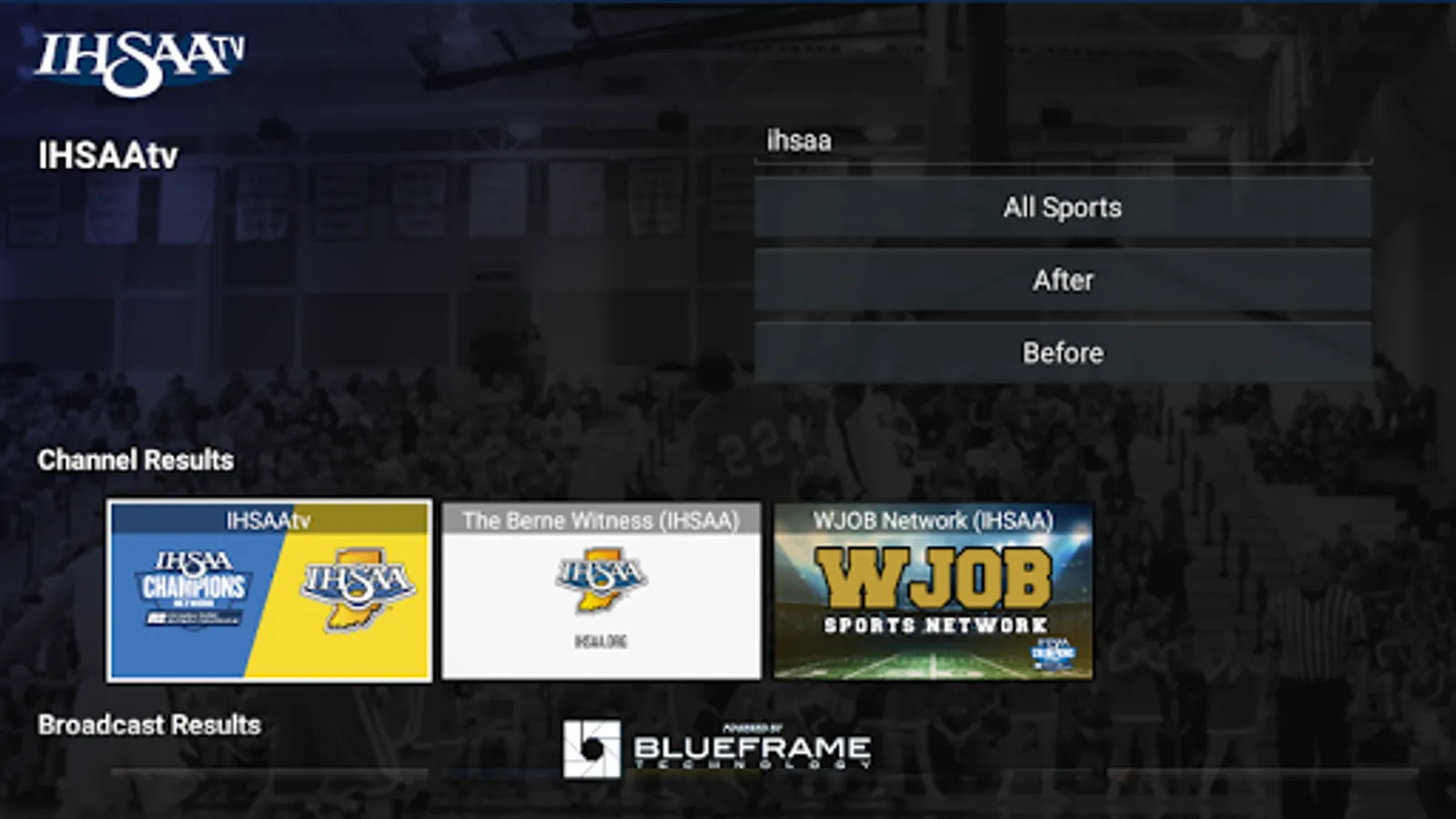 The IHSAA TV Android app gives you quick and easy access to your favorite IHSAA live and archived events. With broadcasts produced by the IHSAA, IHSAA member institutions, and regional broadcasts, IHSAA TV is the go to destination for high school athletics in the state of Indiana. IHSAA TV is a partnership between the IHSAA and BlueFrame Technology.