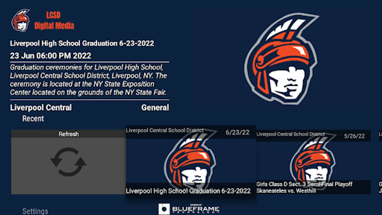 The LCSD Digital Media Android app gives you quick and easy access to your favorite Liverpool CSD live and archived events. With broadcasts produced by the Liverpool CSD and Liverpool CSD member institutions, the LCSD Digital Media Android app is the go to destination for Liverpool CSD sports. LCSD Digital Media is a partnership between the Liverpool CSD and BlueFrame Technology.