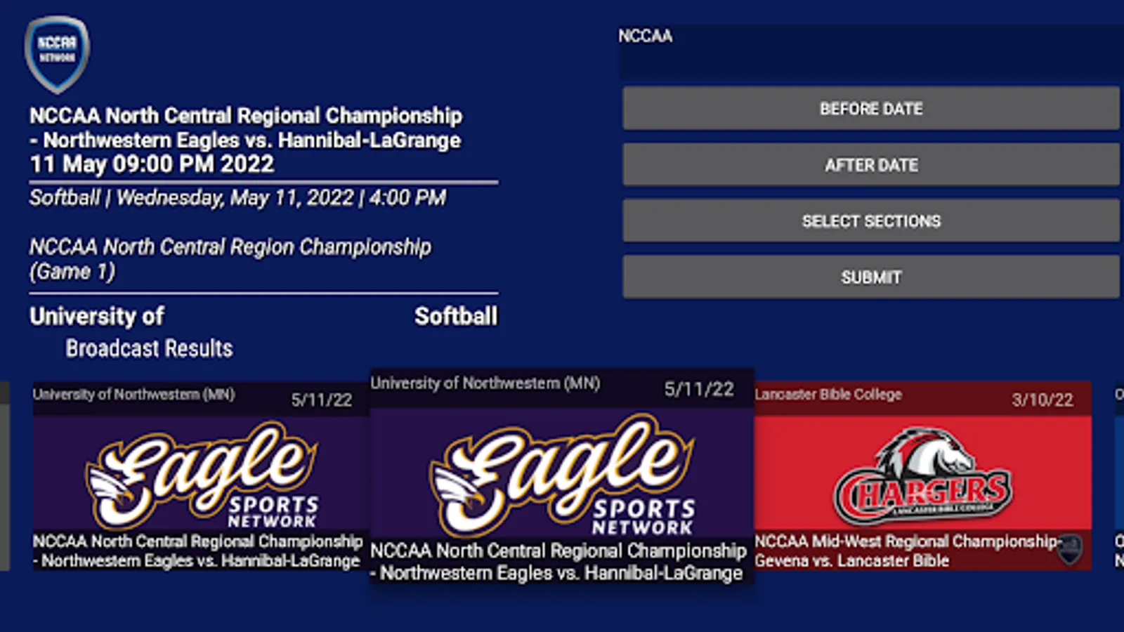The NCCAA Network Android app gives you quick and easy access to your favorite NCCAA live and archived events. NCCAA Network is a partnership between the NCCAA and BlueFrame Technology.