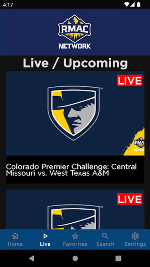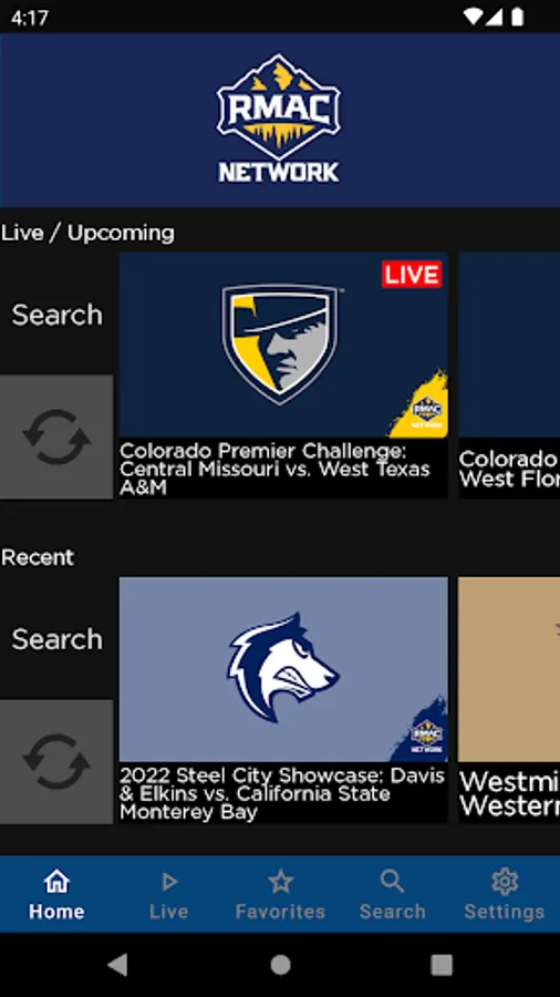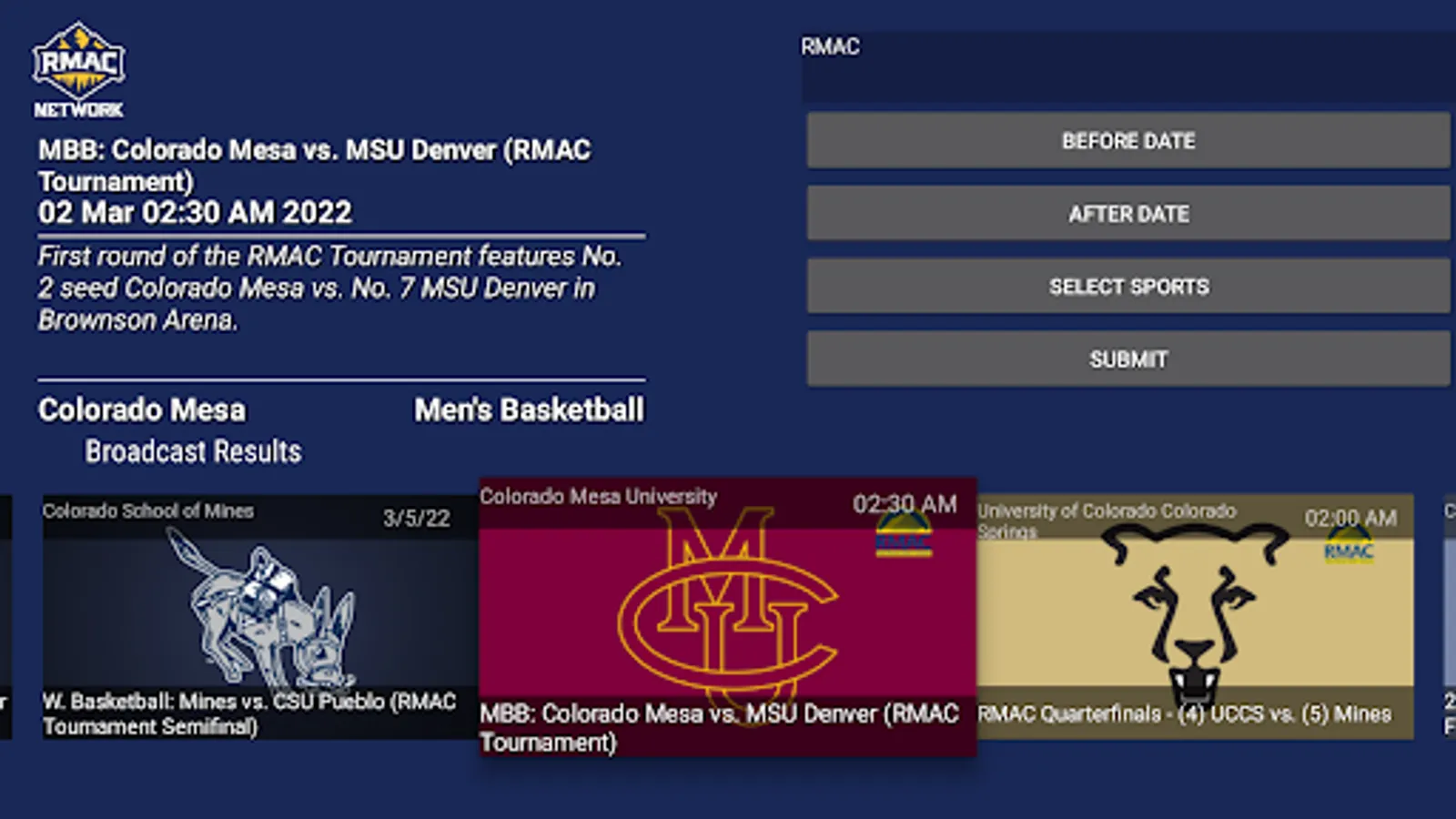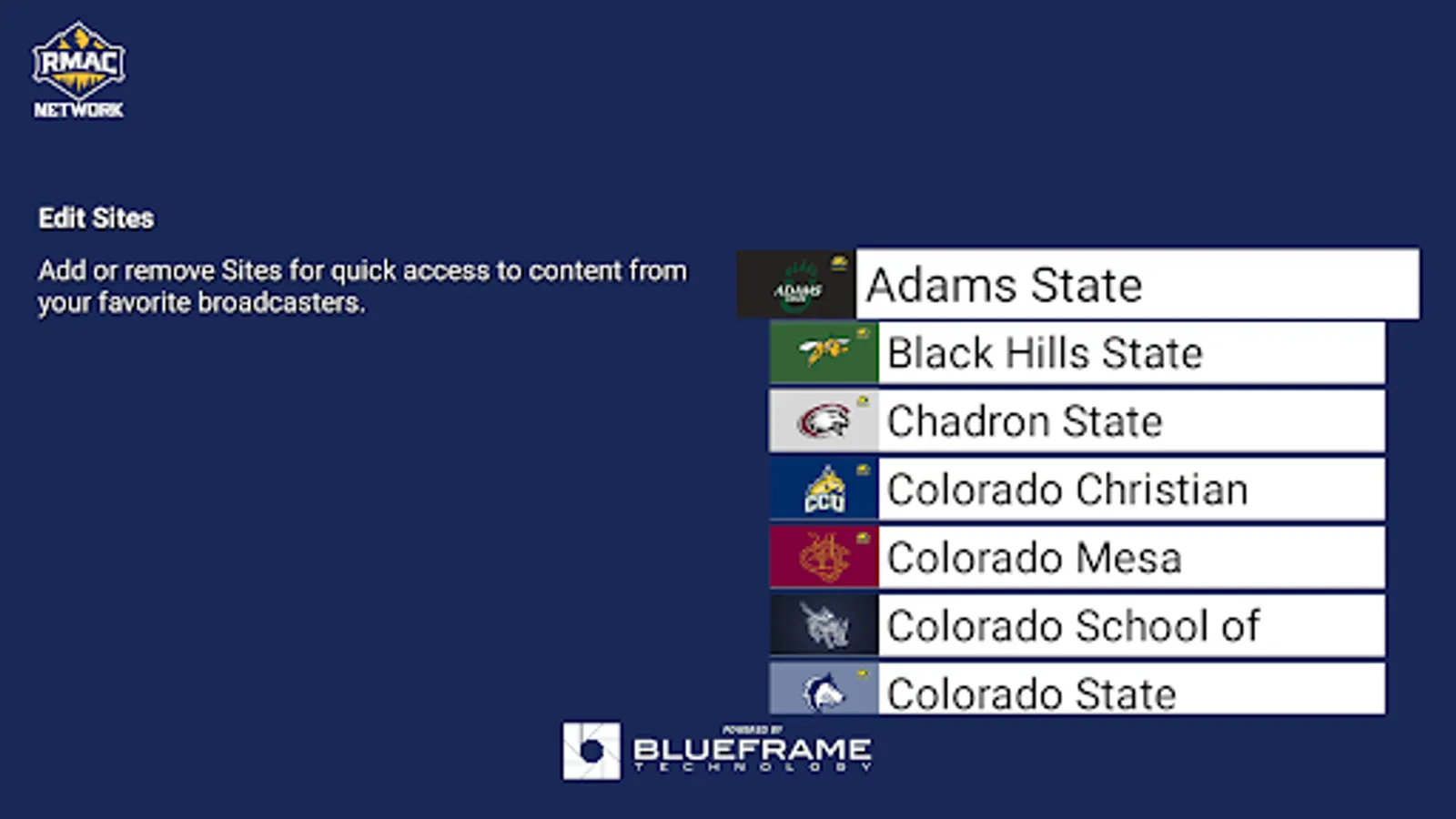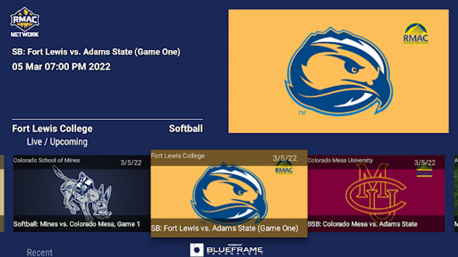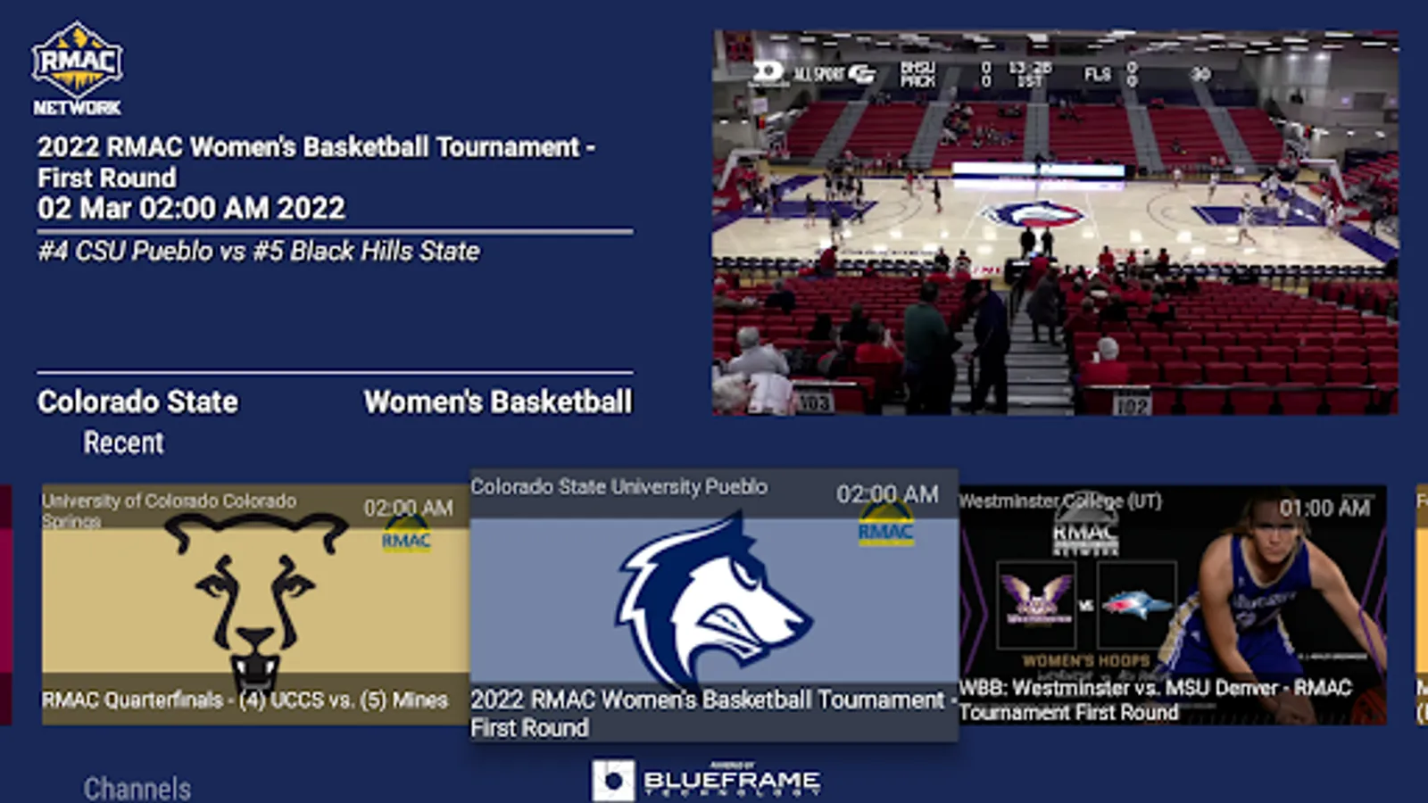 The RMAC Network Android app gives you quick and easy access to your favorite RMAC live and archived events. With broadcasts produced by the RMAC and RMAC member institutions, the RMAC Network Android app is the go to destination for RMAC sports. The RMAC Network is a partnership between the RMAC and BlueFrame Technology.
