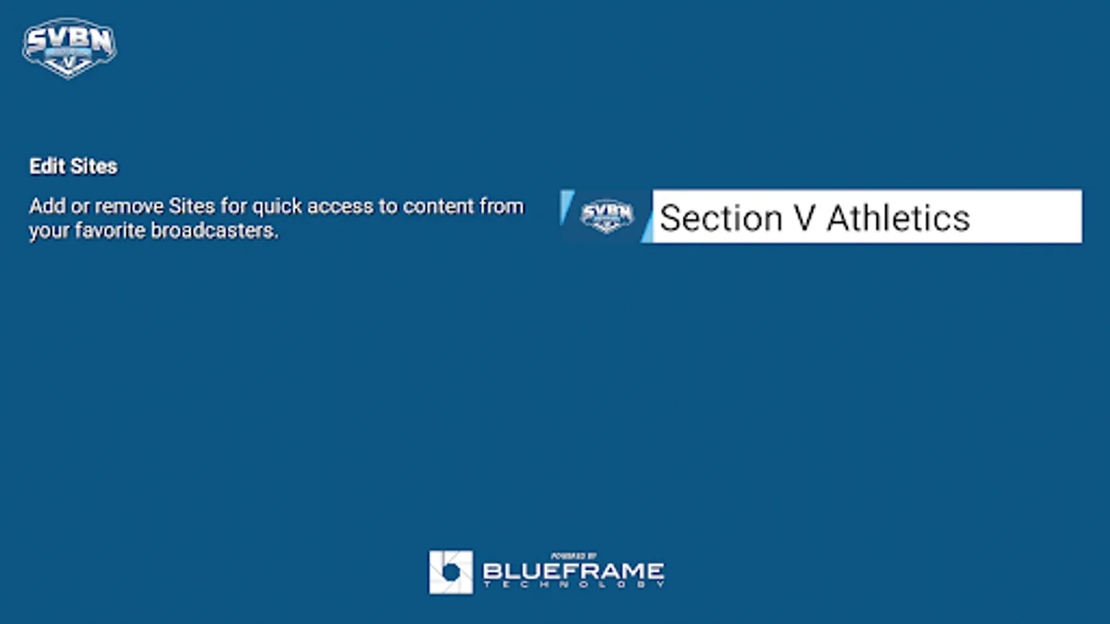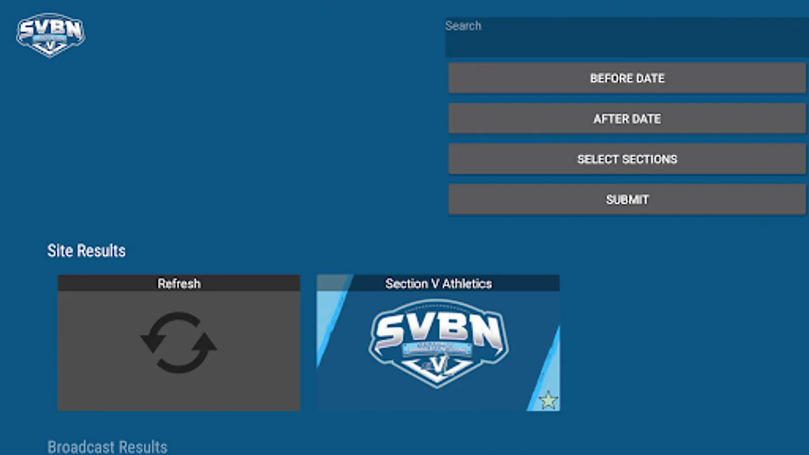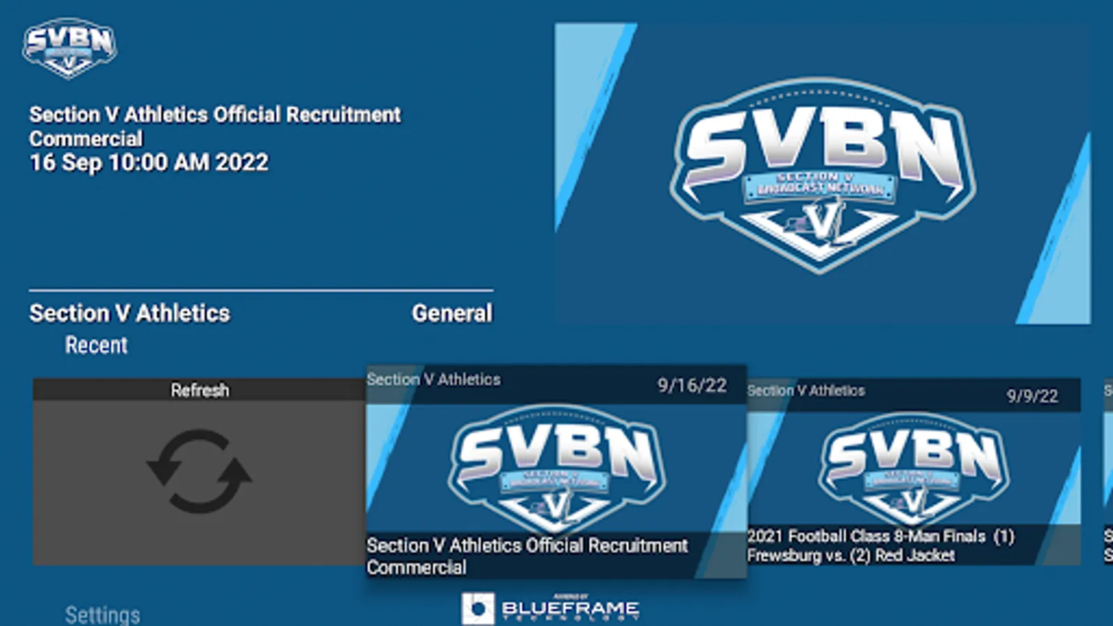 The Section V Broadcast Network Android app gives you quick and easy access to your favorite Section V Athletics live and archived events. Section V Broadcast Network is a partnership between Section V Athletics and BlueFrame Technology.
