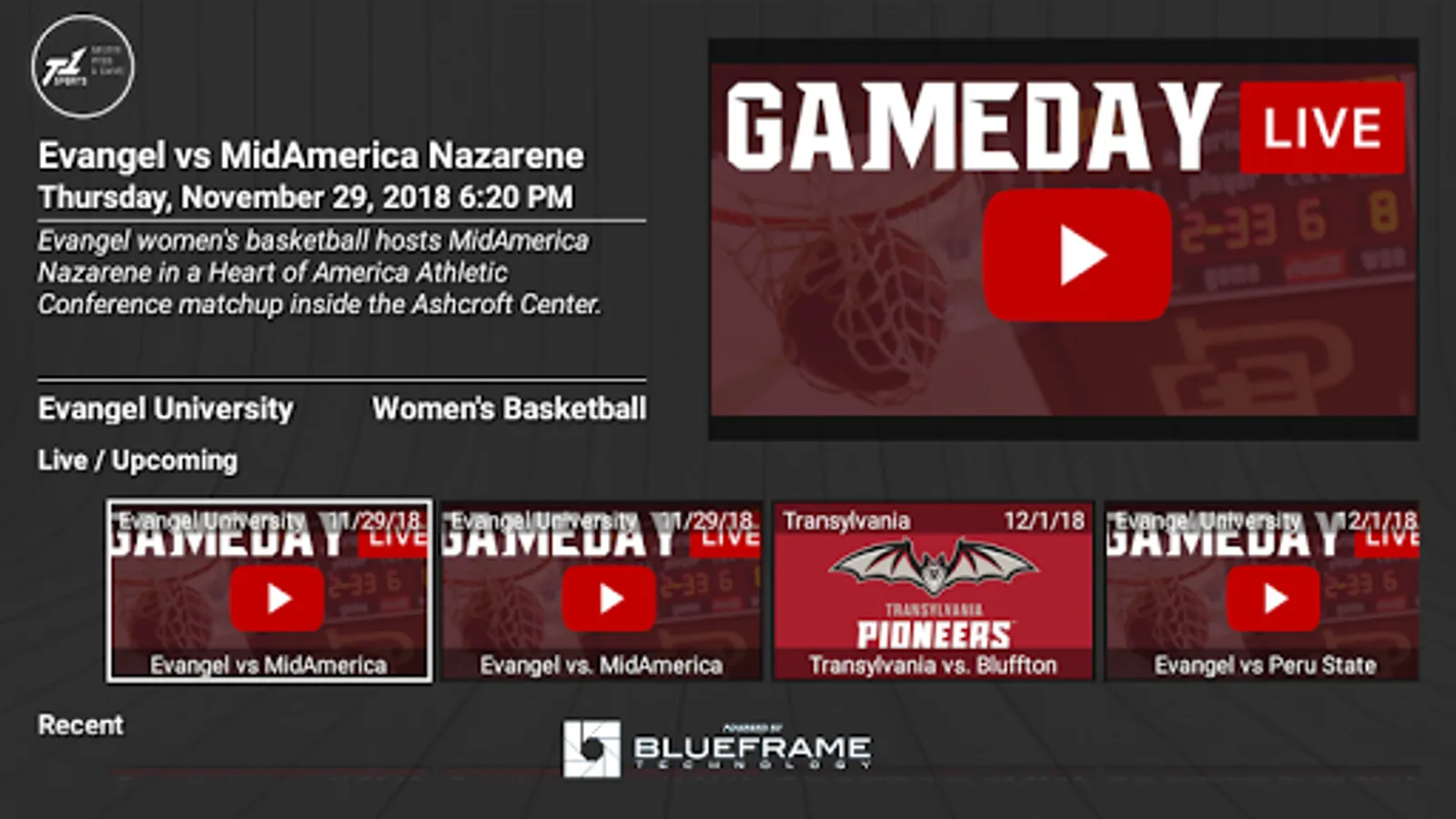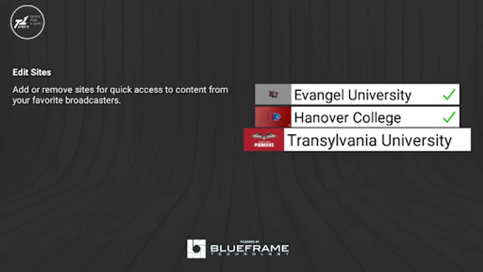 The Team1Sports apps deliver a premier OTT experience for school-generated intercollegiate sports content. Any collegiate athletic organization will now be able to easily add connected TV streaming devices to their set of fan engagement tools. Schools can use their existing workflows, or use BlueFrame Production Truck® software and vCloud™ services, to easily make their live and on-demand events available across multiple streaming services. They can also use the OTT apps to watch instant replays and time-shifted live streams.