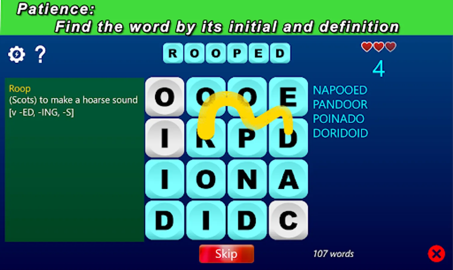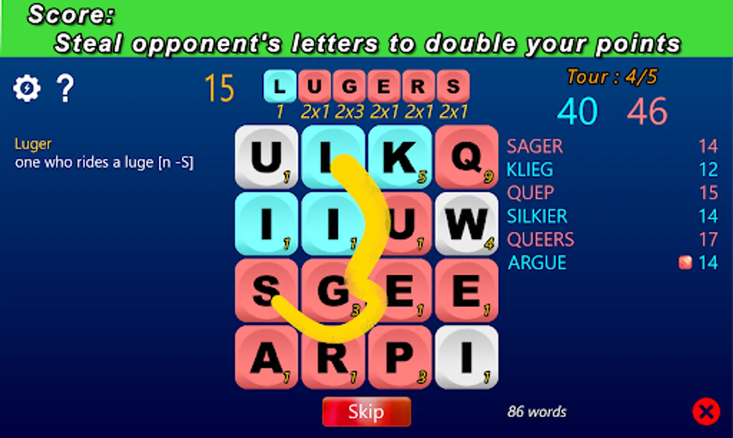 SCORE: each letter has a value (1 to 9). Find words to score maximum points. The letters previously played by your opponent count double, steal them all!