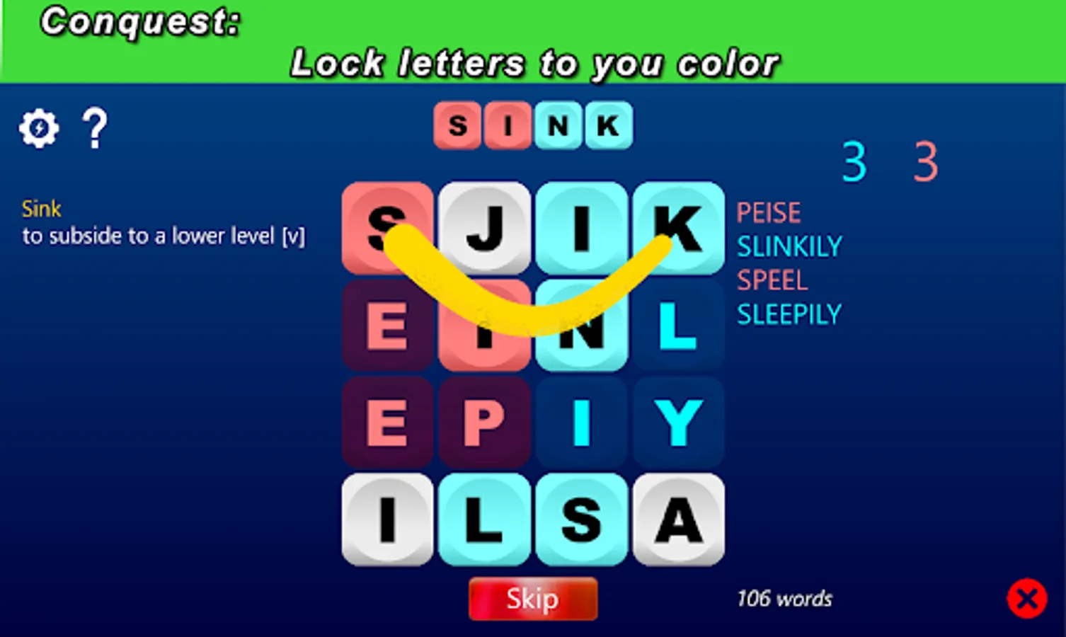CONQUEST: When you form a word the letters take on your color. Reuse the letters of your color to lock them: the opponent will no longer be able to take them from you. Who will block the most letters?