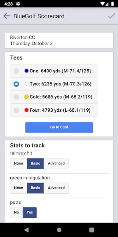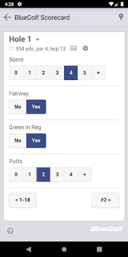 • Great shot tracking - Record Fairways Hit, GIR, Putts, Up & Down and much more. 1 tap for each. Easily customize which shots you want to track. Fast and easy to use.
