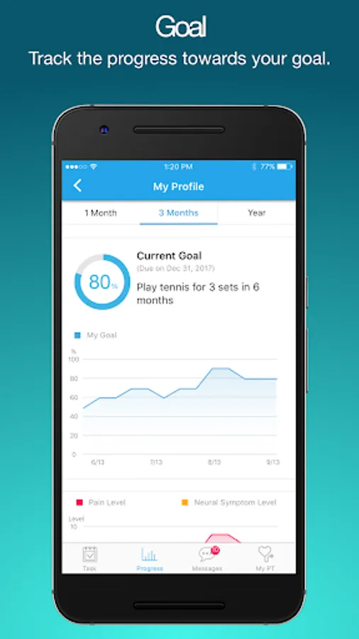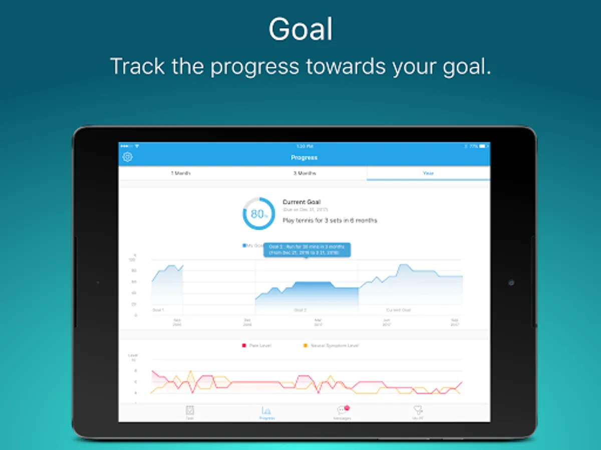 The progress graph allows you to monitor your pain and movement over the period of your exercise program. This information is also sent to your therapist so that she/he can assess your progress and adjust your program accordingly.