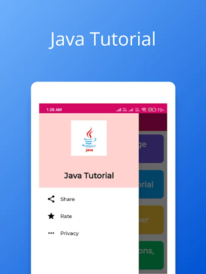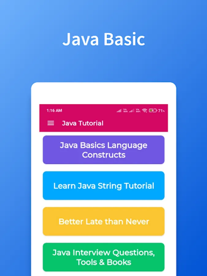 This java enables you to carry java programming Tutorials in your android phone. It contains about 100 Programs.