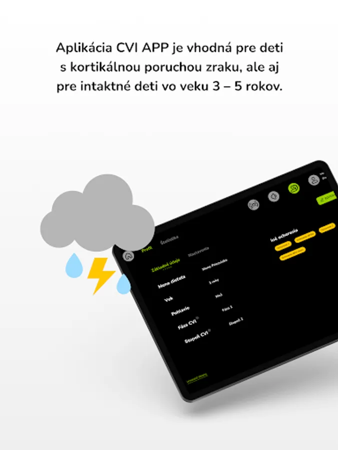 The CVI APP is suitable for children with cortical visual impairment (CVI) in all three stages of visual impairment, as well as for intact children aged 3-5 years. It contains three tasks: Peas, Day and Night, Shapes, with each task available in three levels of difficulty. Thanks to advanced settings, the application can be adapted to your child's needs.