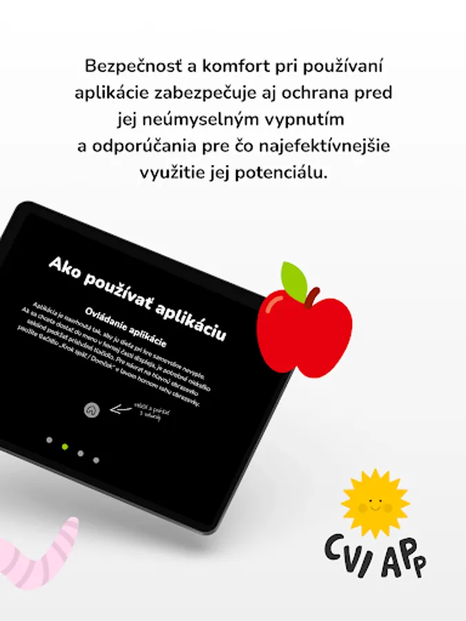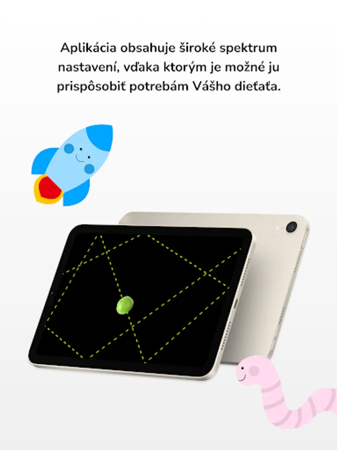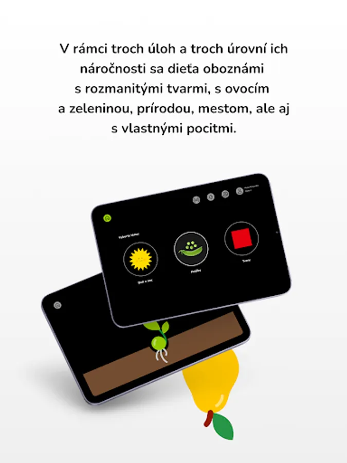 Visual stimuli are complemented by sounds and audio recordings that accompany the child in completing individual tasks. Depending on the level of difficulty, the child's interaction with the application or the complexity of the plot of the chosen task also increases. When completing tasks, the child can thus stimulate and develop not only his sight, but also other senses (hearing, touch). The variety of tasks helps the child to become familiar with different objects, geometric shapes or fruits and vegetables and to recognize them based on their characteristic visual signs. The tasks will guide the child through the city and nature and introduce him to a wide range of feelings and how it is possible to work with them.