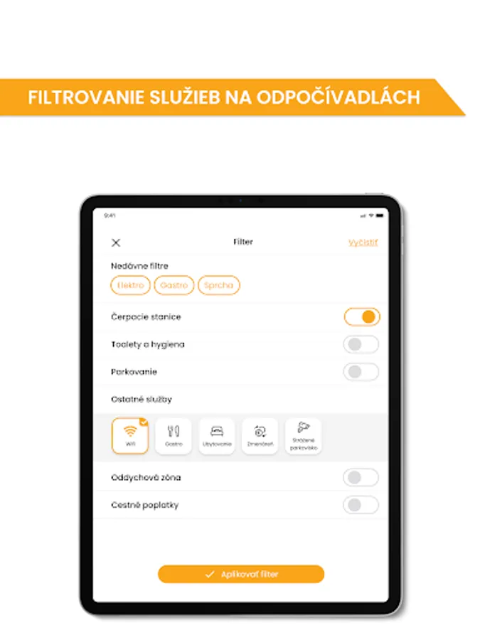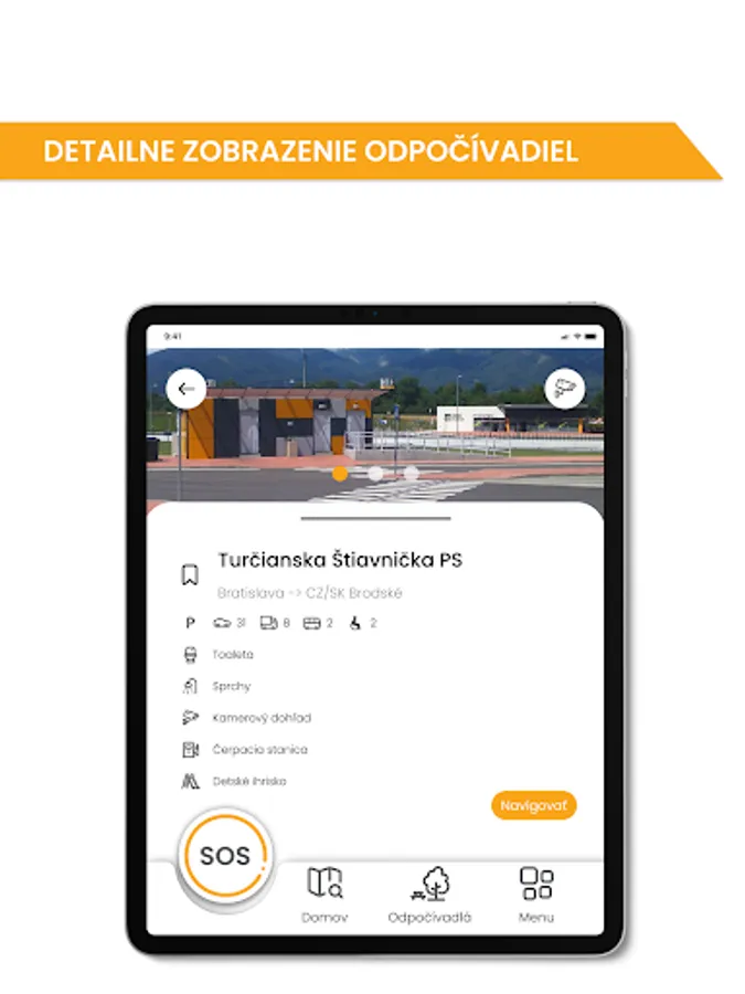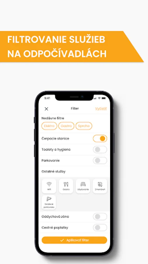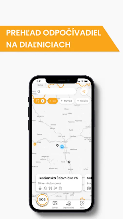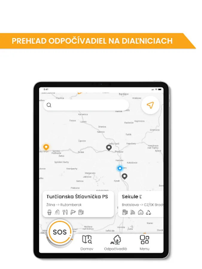 The main functions are the call of the motorway patrol, which will help you in the event of a breakdown of your vehicle on the motorway, a detailed overview of rest areas and services located on them, and last but not least an extensive filter with which you can easily select the services you prefer on motorways.
