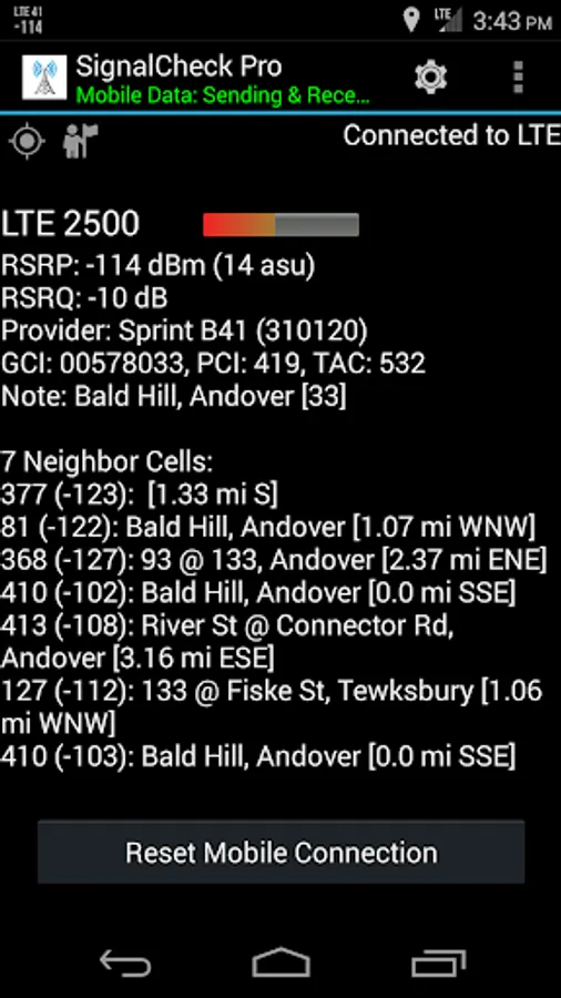 Other features include the ability to automatically keep the screen on while SignalCheck Pro is in the foreground, display of your base station location (CDMA 1X site/sector location) street address and instantly show it in your favorite mapping app by tapping on it, and a home screen widget that shows current connection type and real-time signal strengths. Each widget field is color-coded so signal information can be checked with a quick glance.
