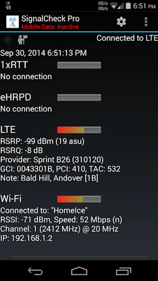 SignalCheck allows users to check the true signal strength and details about their connections. The standard Android signal bars and connection indicators are often inaccurate; SignalCheck shows you true detailed signal information about all of your device's connections, including 5G-NR, LTE (4G), 1xRTT CDMA, EV-DO / eHRPD, HSPA, HSDPA, HSPA+, HSDPA, HSUPA, and other GSM / WCDMA technologies. Data about your current Wi-Fi connection is also displayed, including signal strength, SSID, link speed, and IP address.