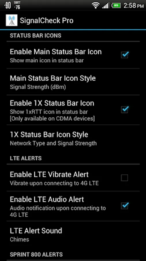One of the best features of SignalCheck Pro are the notification icon(s). A user-customizable icon shows your data connection strength in the notification area at the top of the screen, and more details can be seen in the pulldown menu. Your signal strength is always at the top of the screen along with your other icons.. no need to open the app to check your connections. The icons are customizable, showing signal bars, connection type, digital signal strength in dBm, or connection type with signal strength. A secondary icon can be enabled to always display the 1xRTT signal for CDMA users. All of this is customizable from within the app!