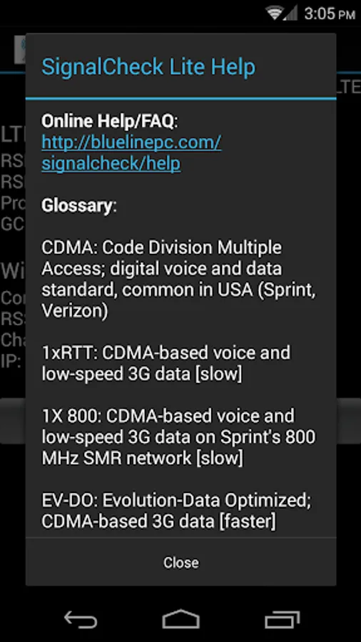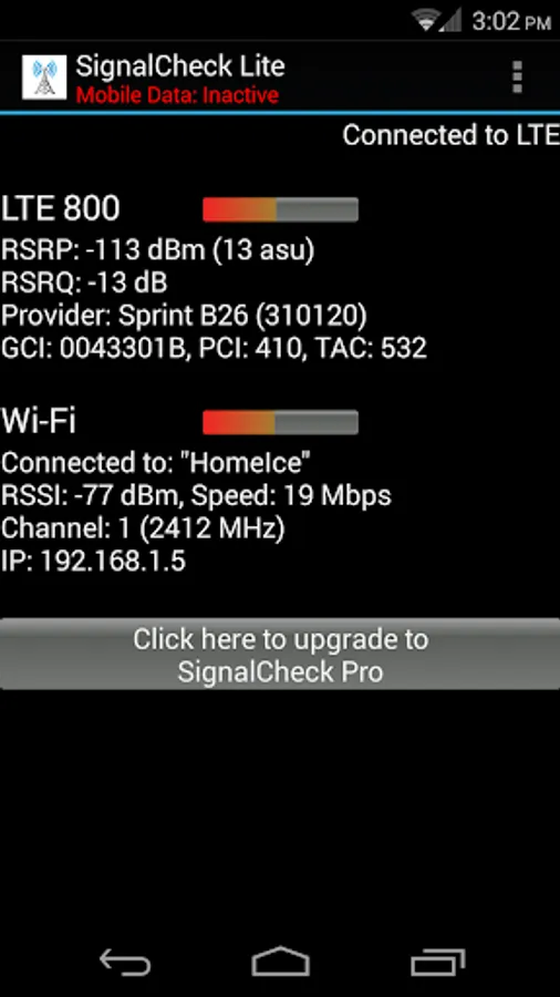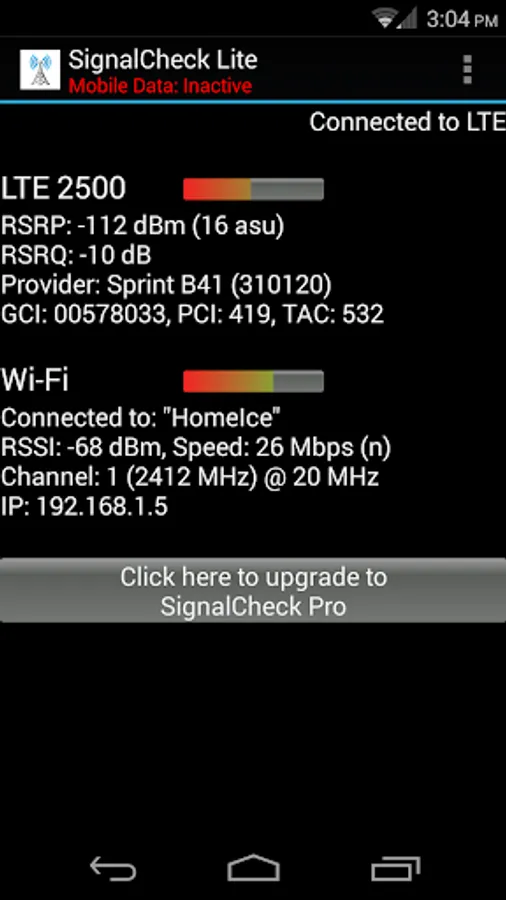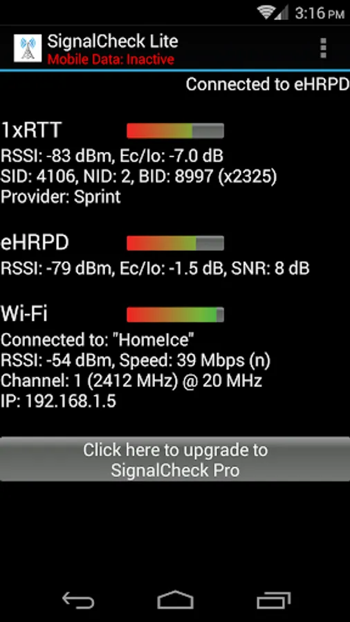 SignalCheck allows users to check the true signal strength of their connections. Unlike the standard Android signal bars, which only display the 1xRTT (voice and low-speed data) signal strength, SignalCheck shows you detailed signal information about all of your device's connections, including 1xRTT CDMA, EV-DO / eHRPD, LTE (4G), HSPA, HSPA+, HSDPA, HSUPA, and other GSM / WCDMA technologies. Data about your current Wi-Fi connection is also displayed, including signal strength, SSID, link speed, and IP address.