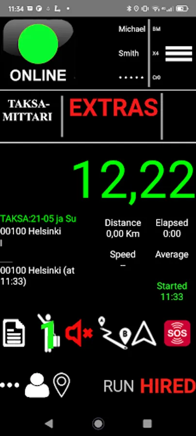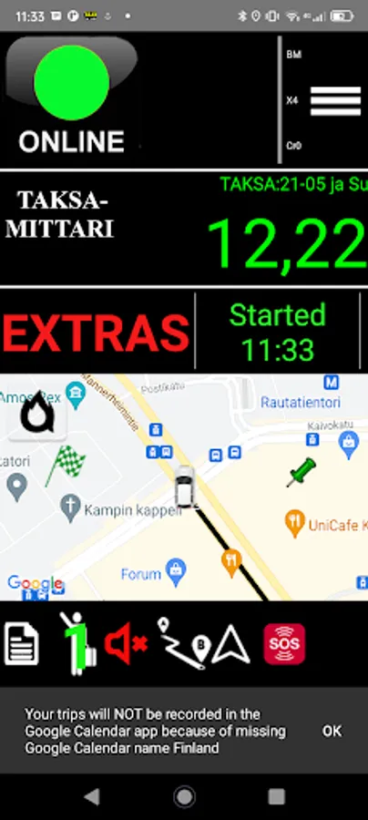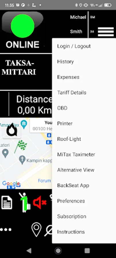 The application also features a legal Traficom-compliant taximeter for pre-arranged flat-rate travel, payment terminal and printer integration, and Mitax-400 bt data transfer.