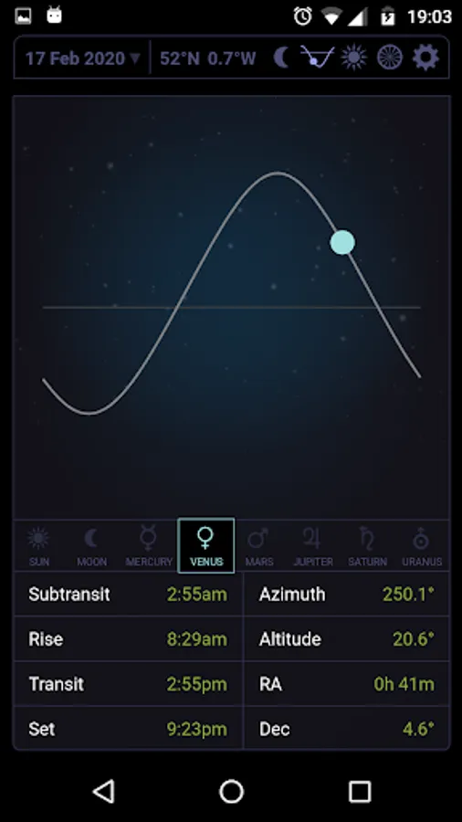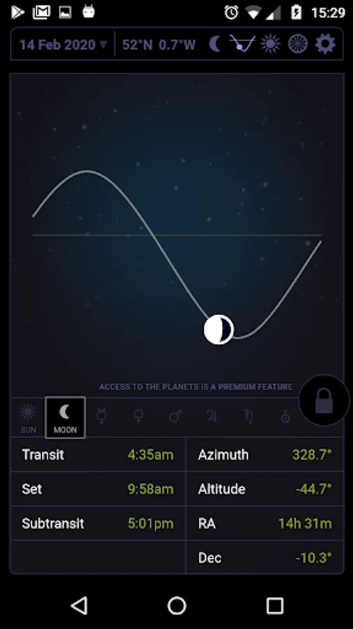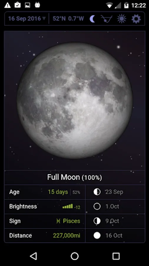 Accurate Moon and Sun details at your fingertips in an attractive interface. View a beautiful real-time image of the current Moon phase, complete with technical data including upcoming Moon phases. Quickly see if the Moon is above the horizon and find Moon rise and set times and precise Moon position in the sky by looking at the Lunar Position screen. If you also want to know Sun rise and set times, look at the Solar Position screen.