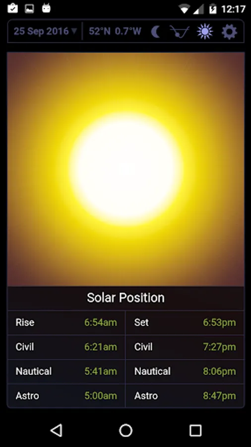 * Sunrise and sunset times, including twilight times (Civil, Nautical and Astronomical)