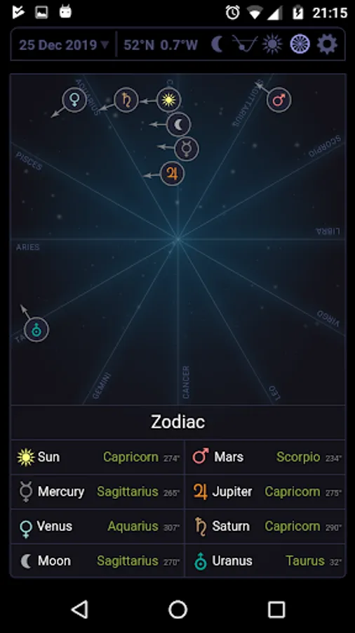 Specific features are listed below. All data is live (real-time), based on your current time and location. An optional, paid upgrade allows the date to be changed to any day, 6,000 BC to 10,000 AD, with the results adjusted accordingly.