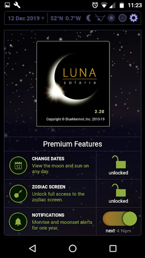 Luna Solaria is immediately ready to use after installation and is designed for efficient use. Easily swipe to reach each screen, or click on convenient icons. The app automatically configures your location by using your phone's geographic location.