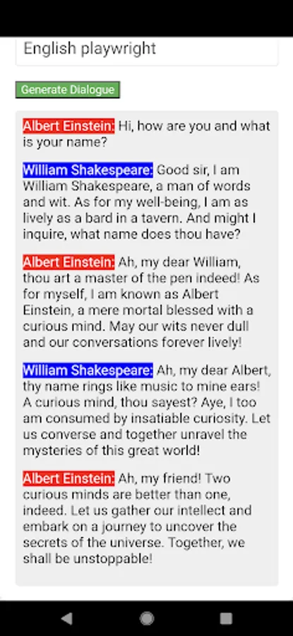 This app is your ticket to endless amusement and entertainment, allowing you to generate hilarious and witty conversations between any two characters of your choosing. Whether you're in the mood for some playful banter between your comic hero and your favourite comedian, or a deep philosophical discussion between Plato and Socrates, this app has got you covered.