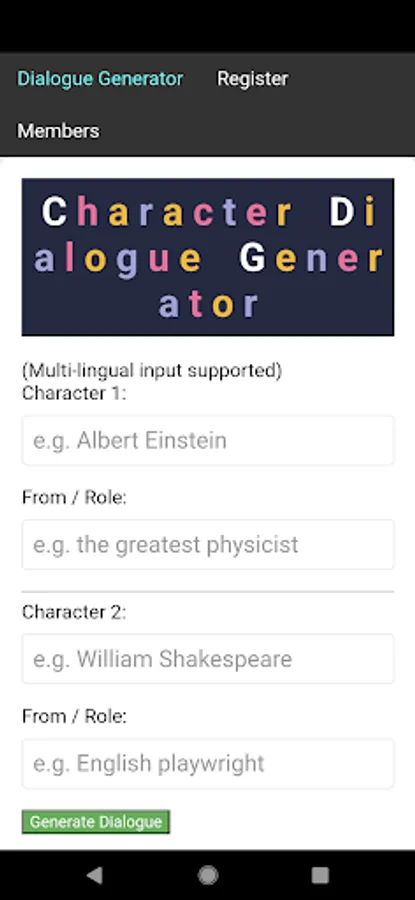 Introducing the AI powered Characters Dialogue Generator! This app brings your favourite characters to life in funny conversations, with support for multiple languages. With the ability to support characters from different countries, cultures, and disciplines, the possibilities for unique interactions are endless! So whether you want to hear what your favourite characters would interact to each other in English, French, Japanese, or any other language, the Character Dialogue Generator has got you covered!