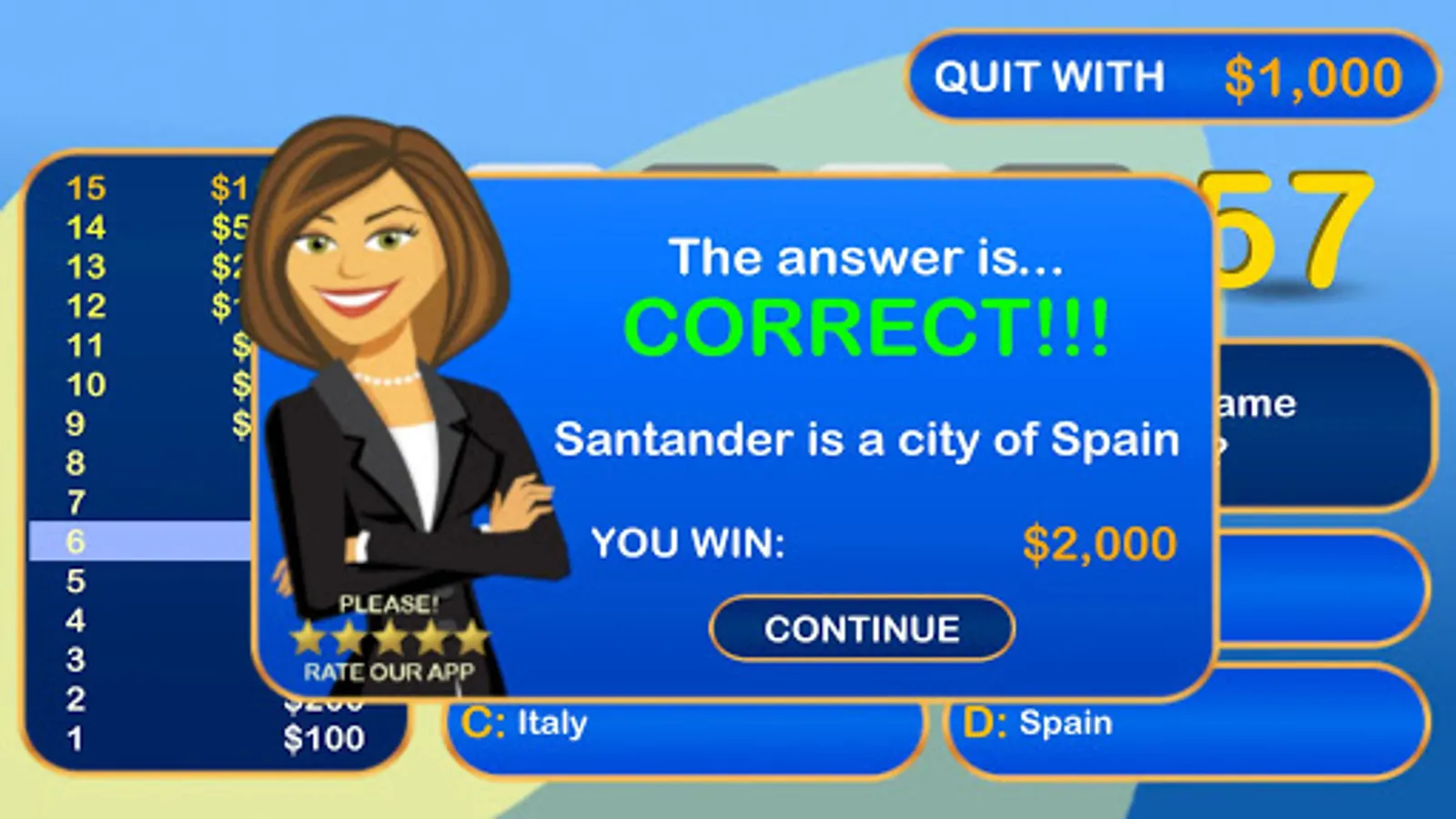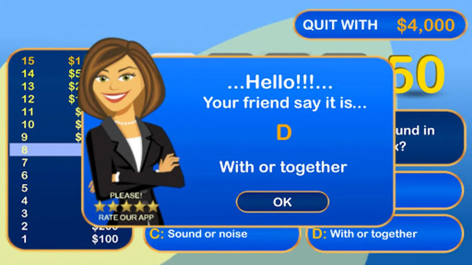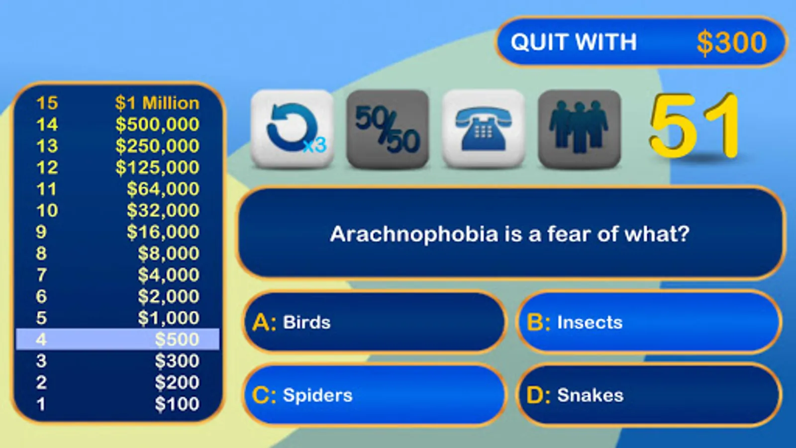 The questions are general knowledge (movies, music, sports, science, etc) and become increasingly difficult during the game. You can use some help during your quest to grow your prize and become a Millionaire: skipping questions, asking for a friend's opinion whom can know the answer, and asking for audience input with their boards.