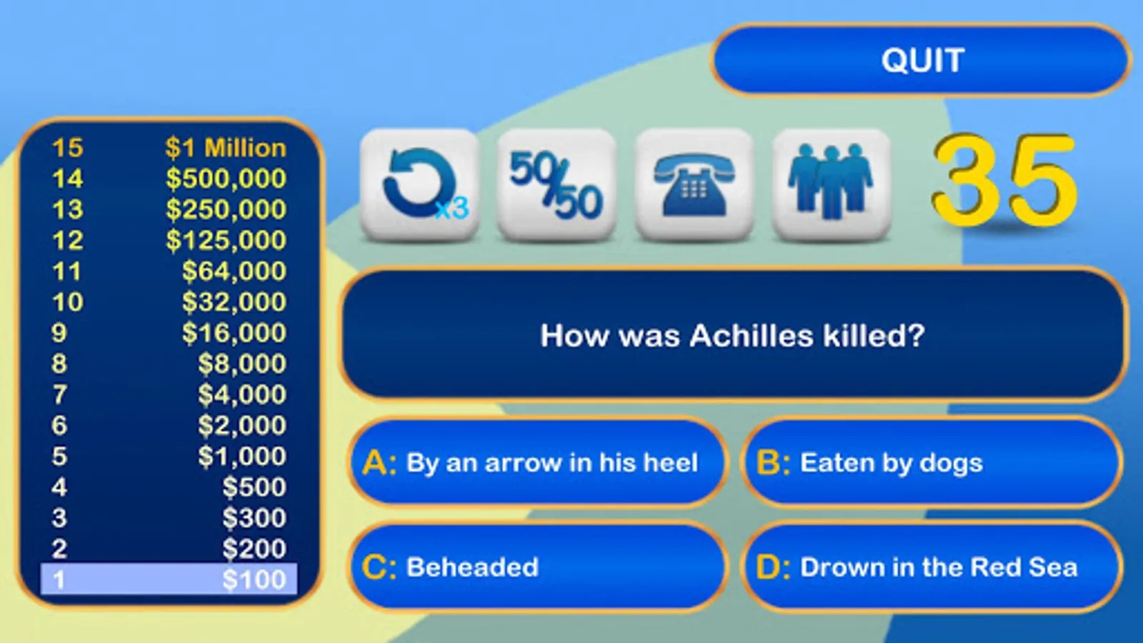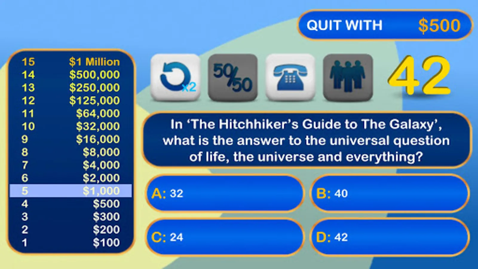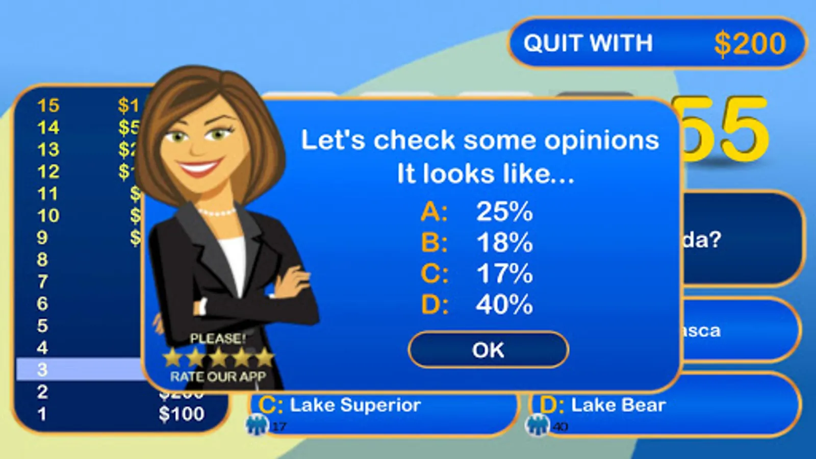 The questions are general knowledge (movies, music, sports, science, etc) and become increasingly difficult during the game. You can use some help during your quest to grow your prize and become a Millionaire: skipping questions, asking for a friend's opinion whom can know the answer, and asking for audience input with their boards.