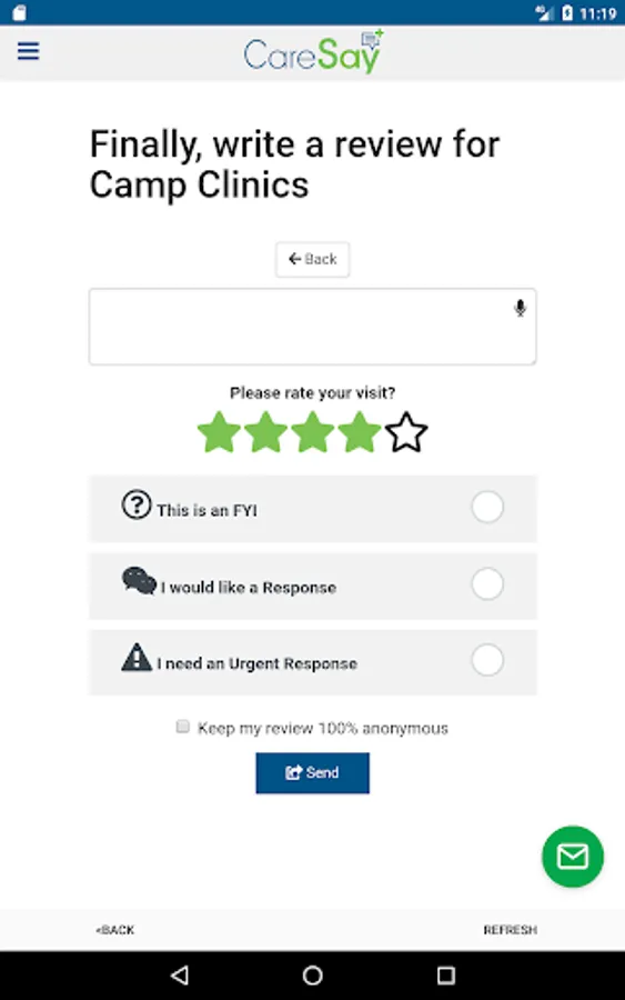 It's time everyone had a say in their care. Empowering patients to give feedback on their own terms. Give feedback and get a qualified response in real-time* or provide an immediate rating directly to the provider. * Pending healthcare provider registration to the CareSay App.