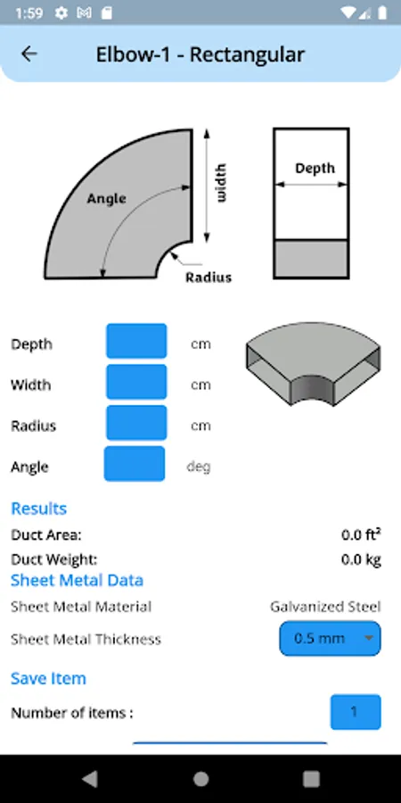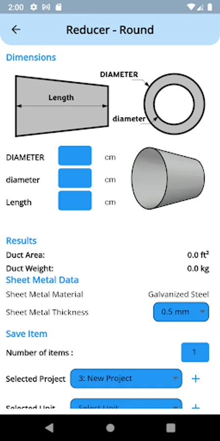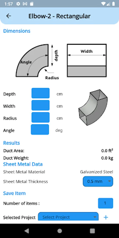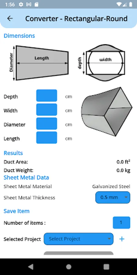 This app can calculate duct surface area and weight and save it into a list of units or a list of projects.