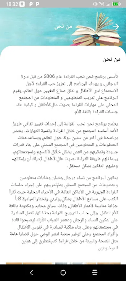 The We Love Reading Program was established in 2006 by Dr. Rana Al-Dajani, and the program aims to enhance the love of reading for children's enjoyment and create change makers around the world. The program is based on training volunteers from the local community on the skills of reading aloud to children and how to conduct reading sessions in the mother tongue.