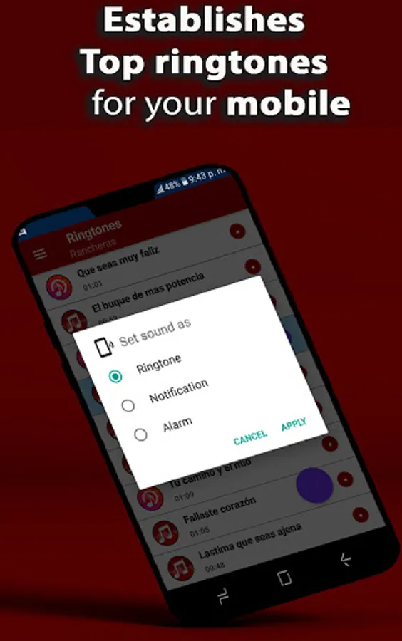 Quickly browse among hundreds of popular music ringtones, now available Mexican rancheras, Use it as popular music ringtones for whatsapp, so that you can be the attention in the place you are, also as rancheras ringtones. Do not forget to take it into account as an alarm so that you start the day with the best energy of ringtones for cell phones. Share with friends on social networks, Download and fully enjoy the best popular music free ringtones application, This application allows you to customize free ringtones, select your favorite tones, alarms, sounds and notifications since they are all in high quality , add them without having to download them, what are you waiting to download this running ringtones app that will meet your expectations. You need to know that this is an application with an internet connection, with incredible sound quality and the best that it is completely free.