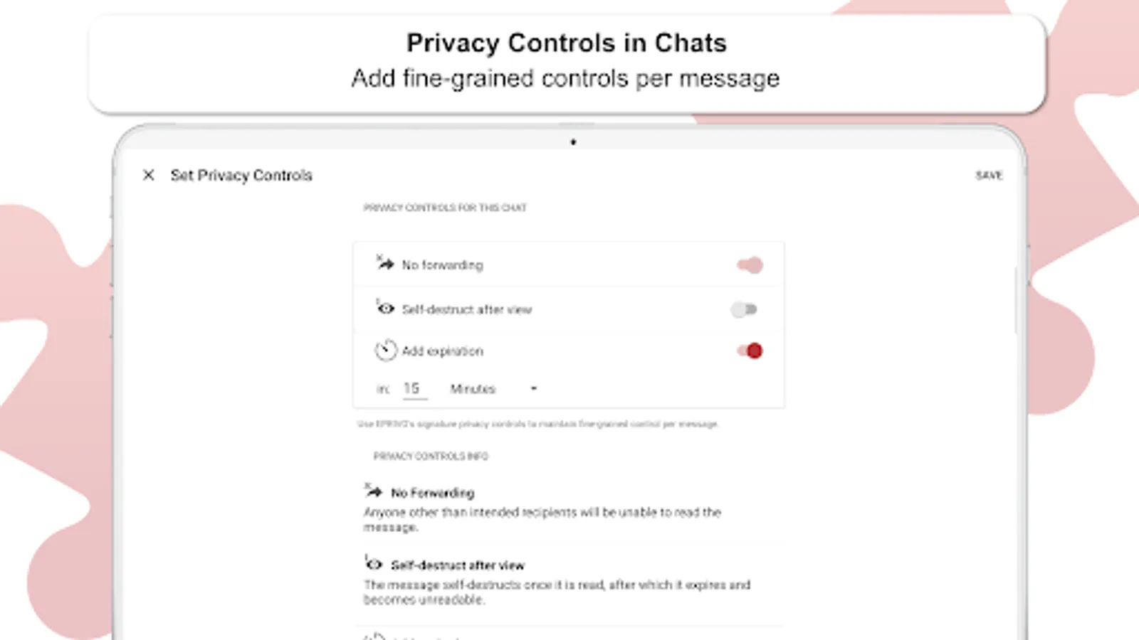 • End-to-end encryption on regular/group Telegram chats with controls (no-forwarding, self-destruct, expiration).