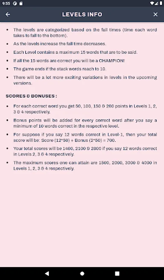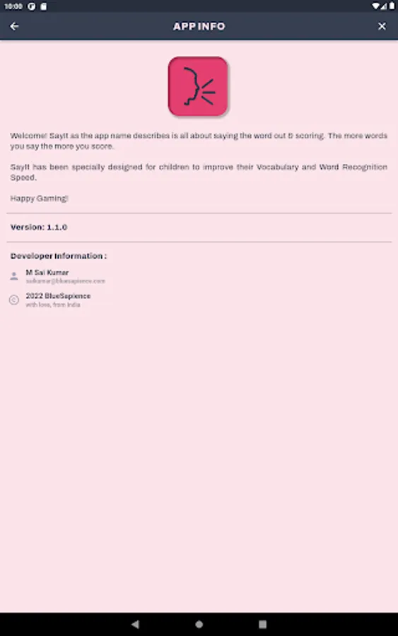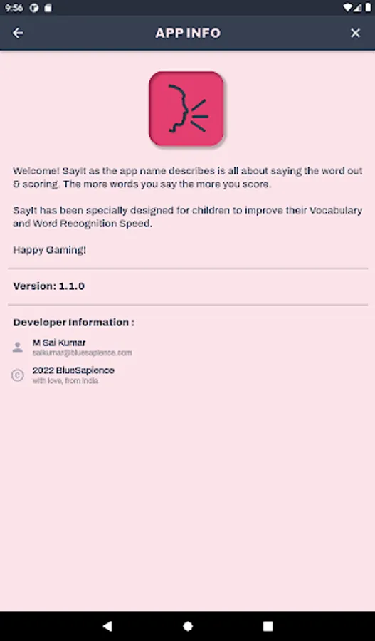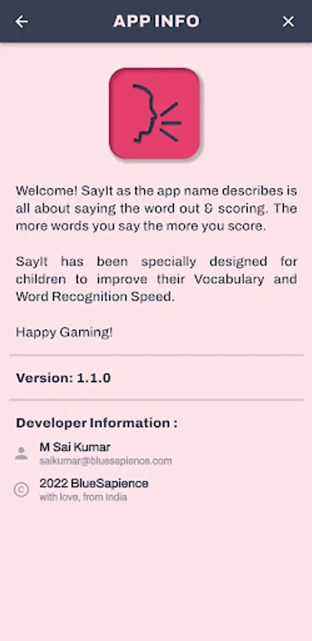 SayIt as the app name describes is all about saying the word out & scoring. The more words you say the more you score. SayIt has been specially designed for children to improve their Vocabulary and Word Recognition Speed. Happy Gaming!