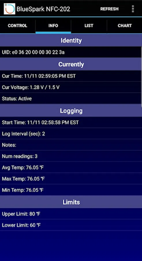 This application is used to read, record and analyze Blue Spark NFC temperature data loggers. The data loggers are used to record the temperature an item is exposed to throughout its’ supply chain journey. The app has a temperature graph that easily identifies temperature excursions from the preset limits.