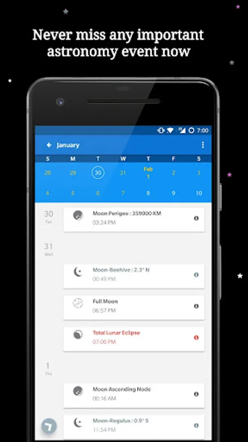 Never miss an important astronomy event now. Scroll through the calendar to get the important upcoming events about Lunar Phases, Eclipses, Equinoxes/Solstices, Moon Apogee/Perigee, Moon-Planet Conjunctions, Planetary Events and Meteor Showers.