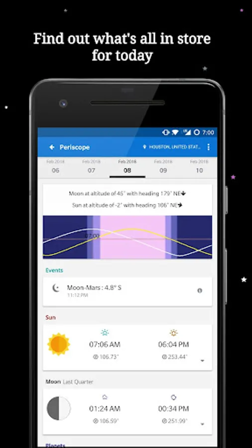 This gives you a visualization of how the Sun and Moon rises and sets or path along any given point of the day from your current location. Along with Sun and the Moon , you will also find the rise and set of the Planets.