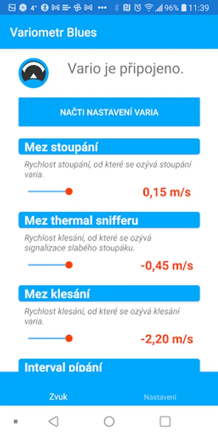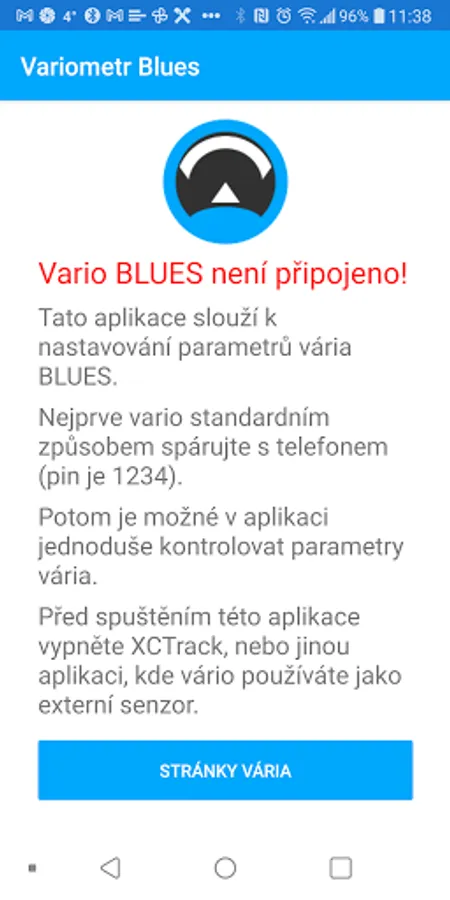 The application is only used to set the parameters of the Blues variometer version II and higher. The variometer must first be connected to the phone via the bluetooth interface.