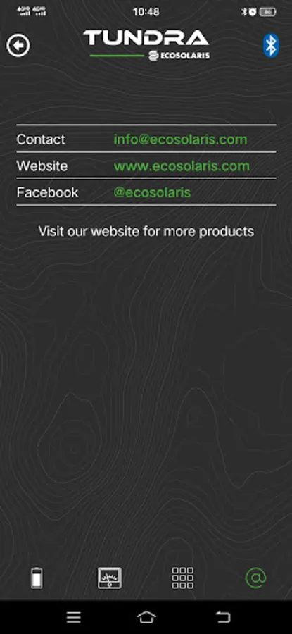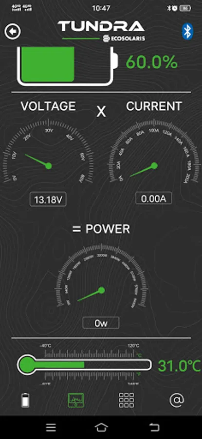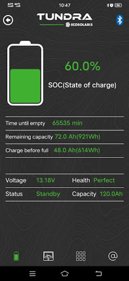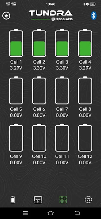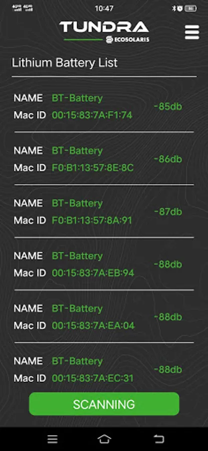 Smart lithium LiFePO4 app developped for the TUNDRA and BOREAL batteries by Ecosolaris. App shows essential information for the user as well as diagnotic data in a seemlessly integrated format. Quickly glance at the state of charge (SOC), voltage, current, power along with more detailed information and alarms. Simple to use, just stand within 5m / 15 ft of battery to preview listed batteries and connect. Can only read one battery at a time.