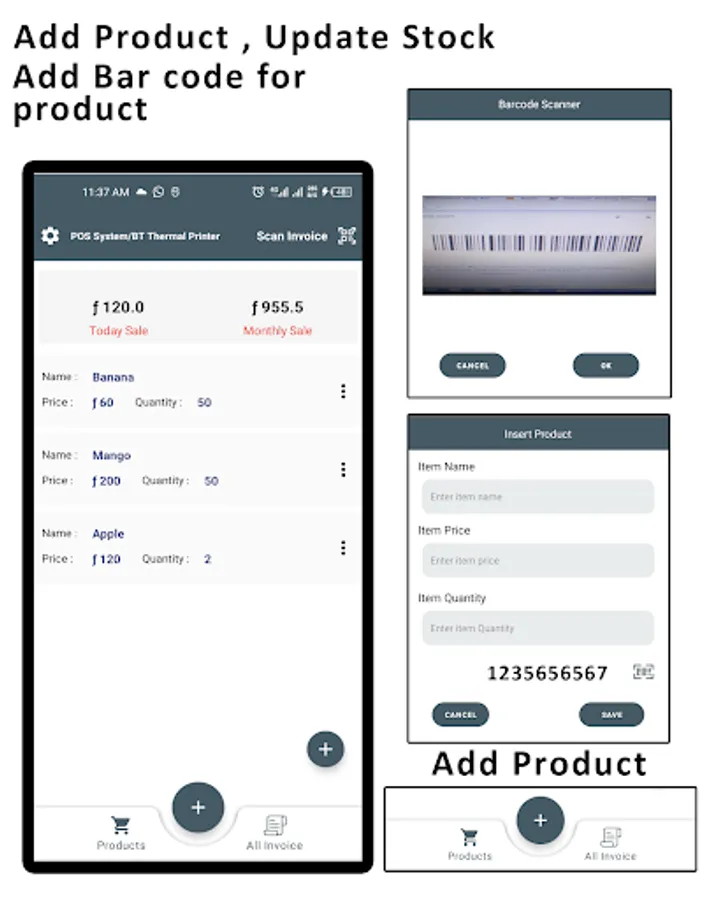 You can easily add Product with quantity and also add barcode to each product, so you can easily add item to invoice by scanning the product barcode. The app also contain barcode scanner.