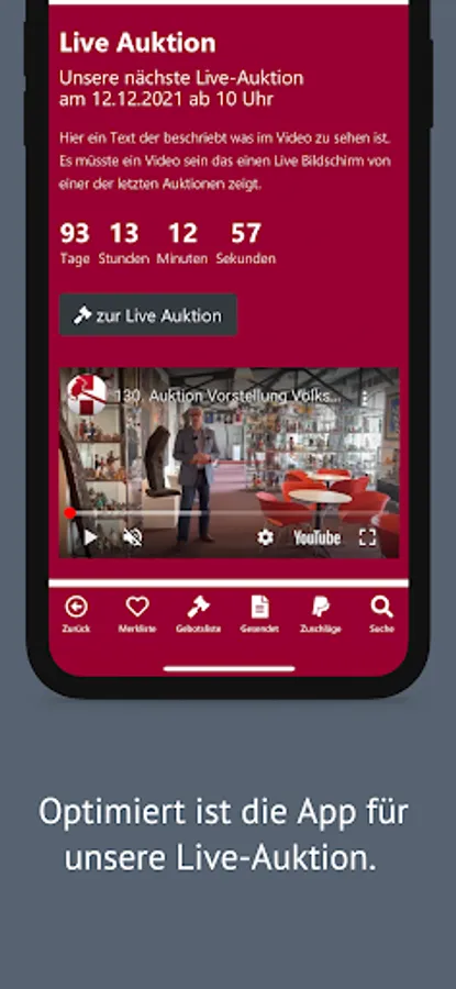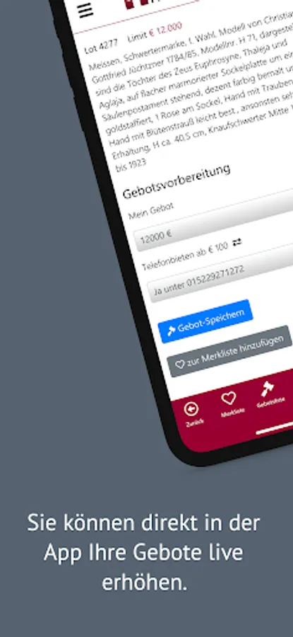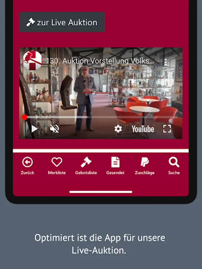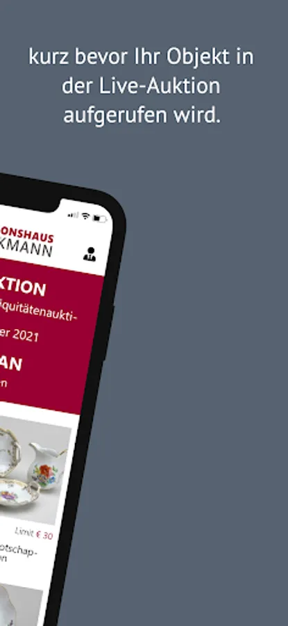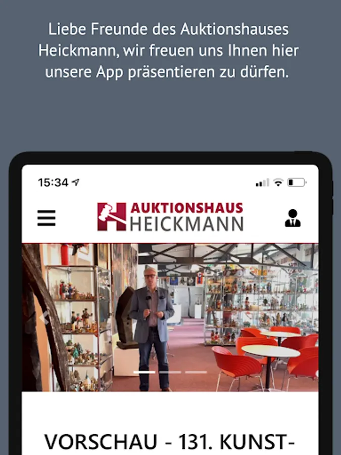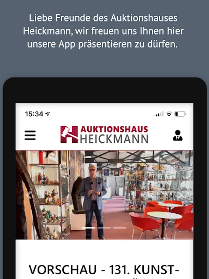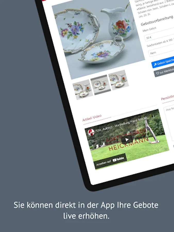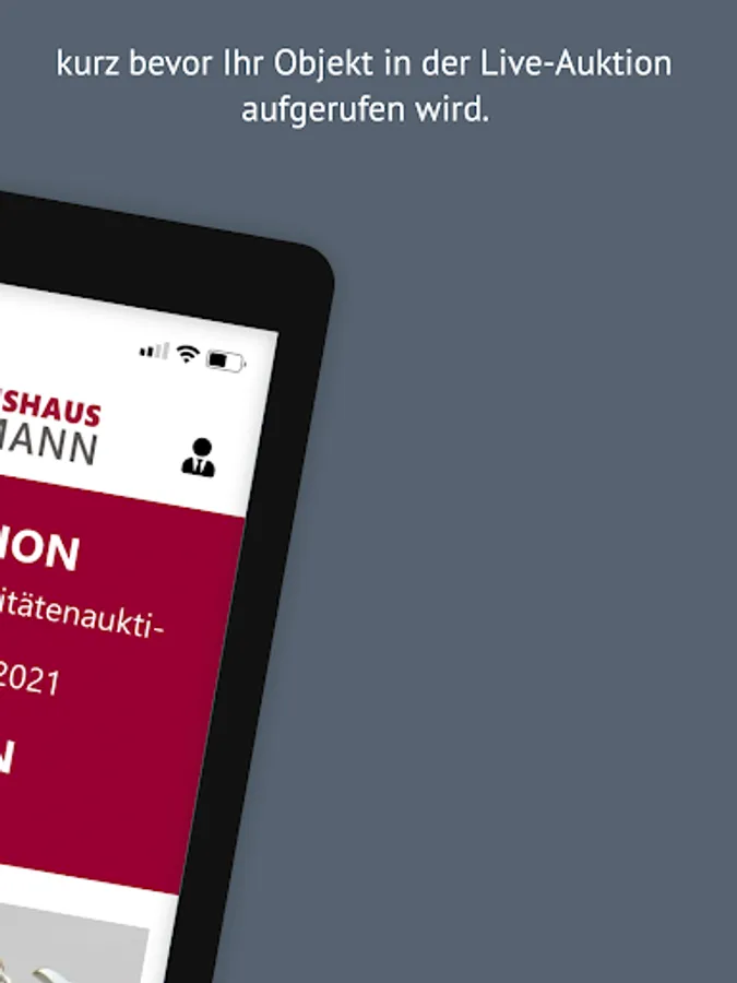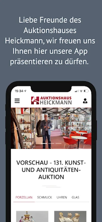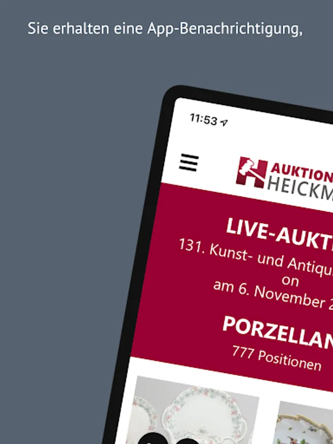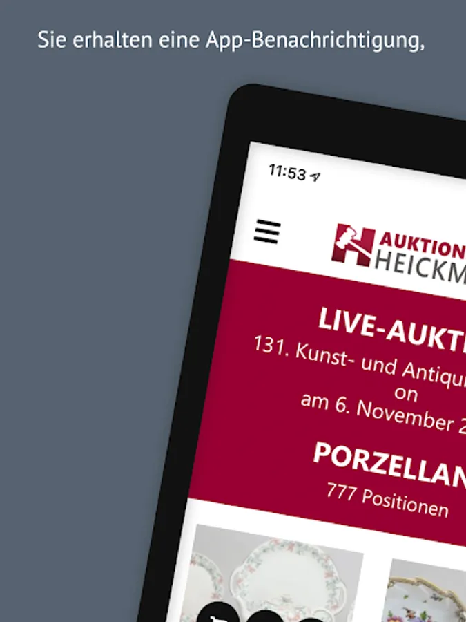 Dear friends of the auction house Heickmann, we are pleased to be able to present our app to you here. With the app you always have an overview of our current auctions as well as your personalized watch lists and bids. The app is optimized for our live auction. You will receive an app notification just before your item is called up in the live auction. You can increase your bids live directly in the app, see the auction with image and sound, and react if you have been outbid. After logging in to the app once, you remain logged in permanently.