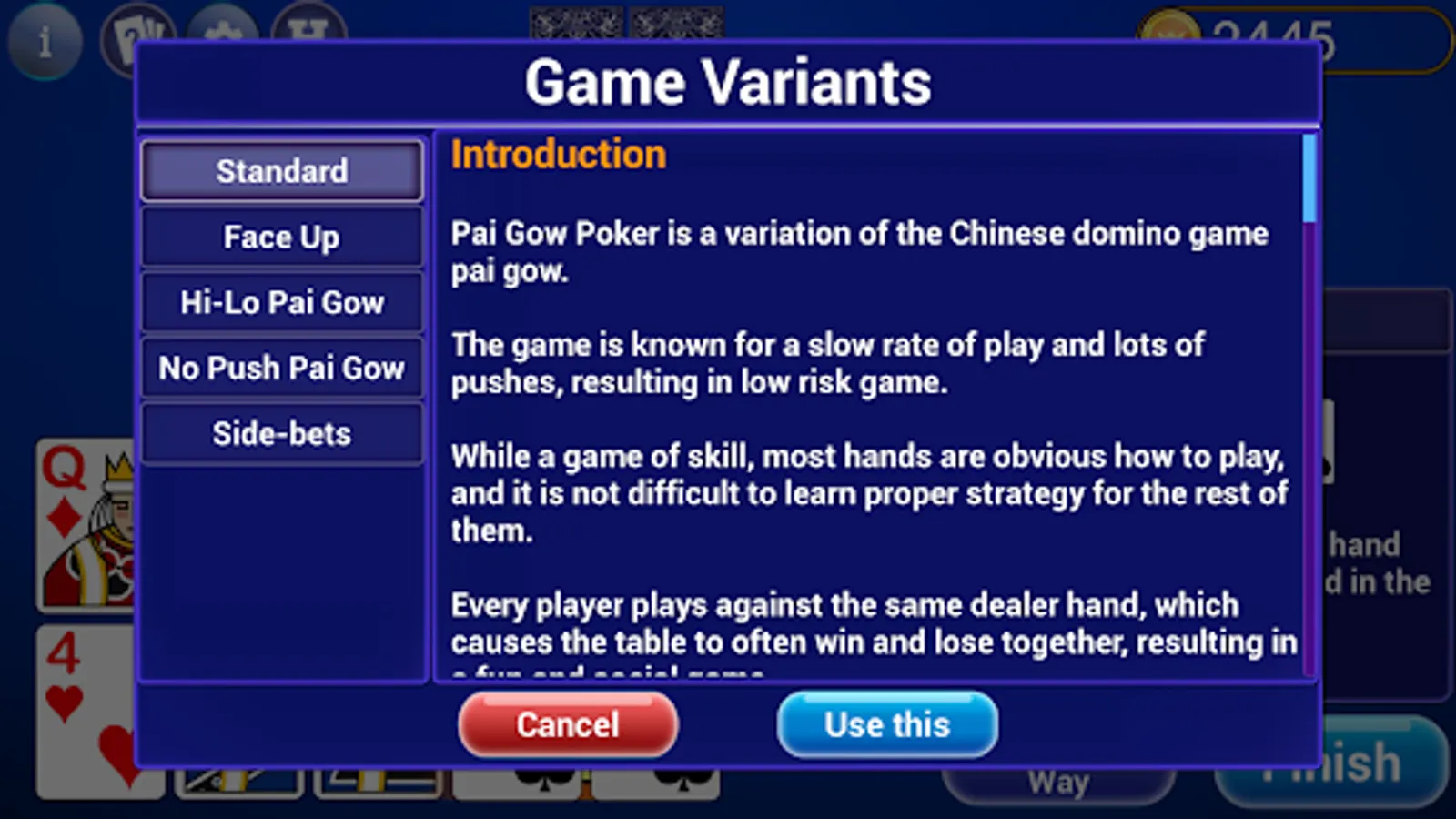 + Different game variants: currently have 4 variants to play in the game: Standard, Face Up, Hi-Lo and No Push Pai Gow.