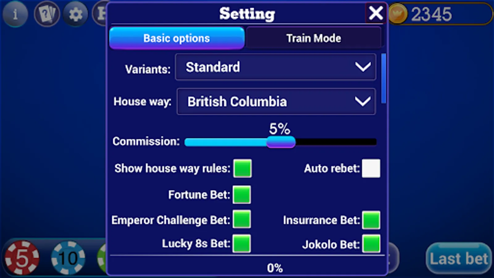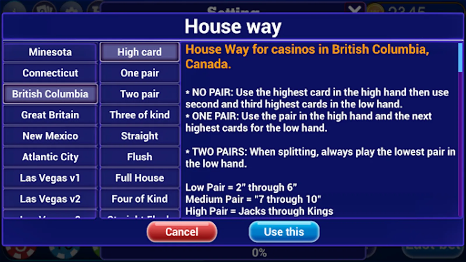 In this Pai Gow Poker game, you can choose house way from many different casinos from the US, UK and Canada.