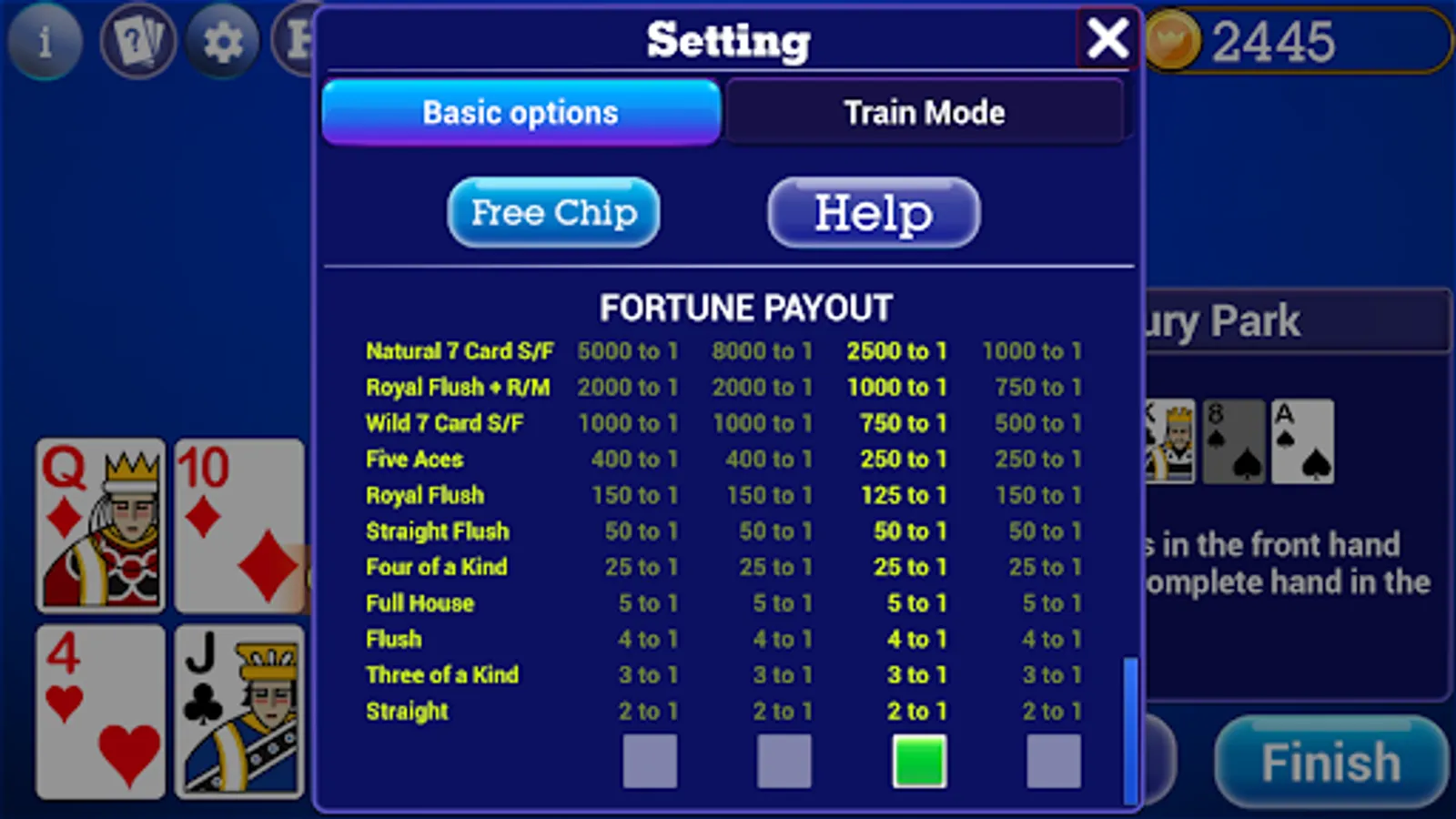 "Fortune" is a side bet in Pai Gow Poker that pays based on the value of the player's seven cards. It doesn't not matter how the player sets his hand. Different casinos use different payout rate for this side bet, you can choose your payout that suit your best in setting panel