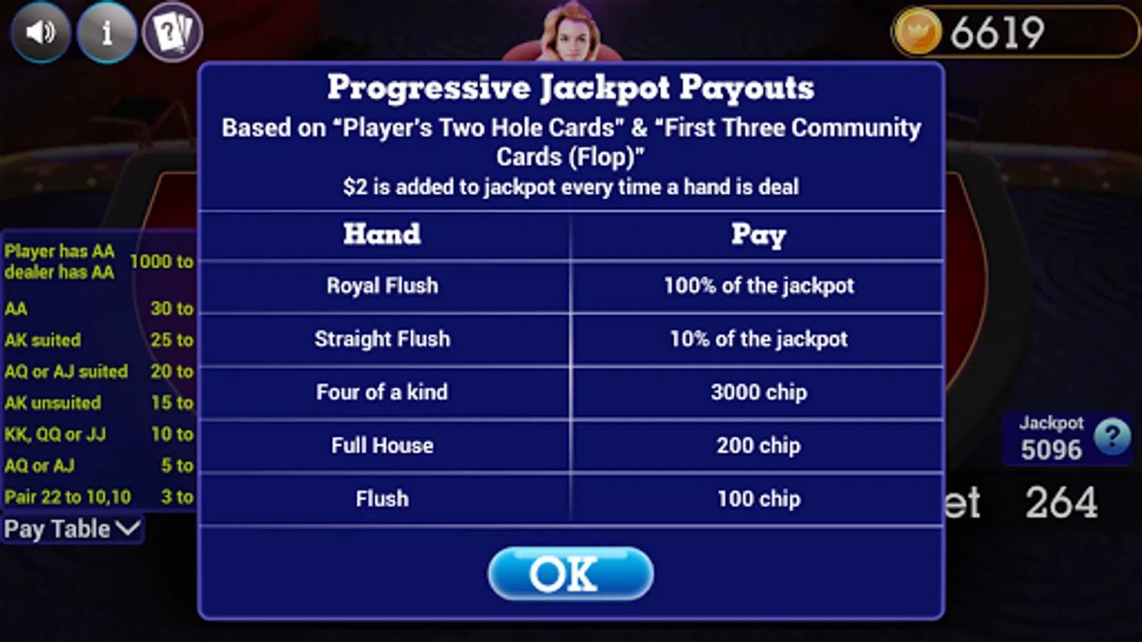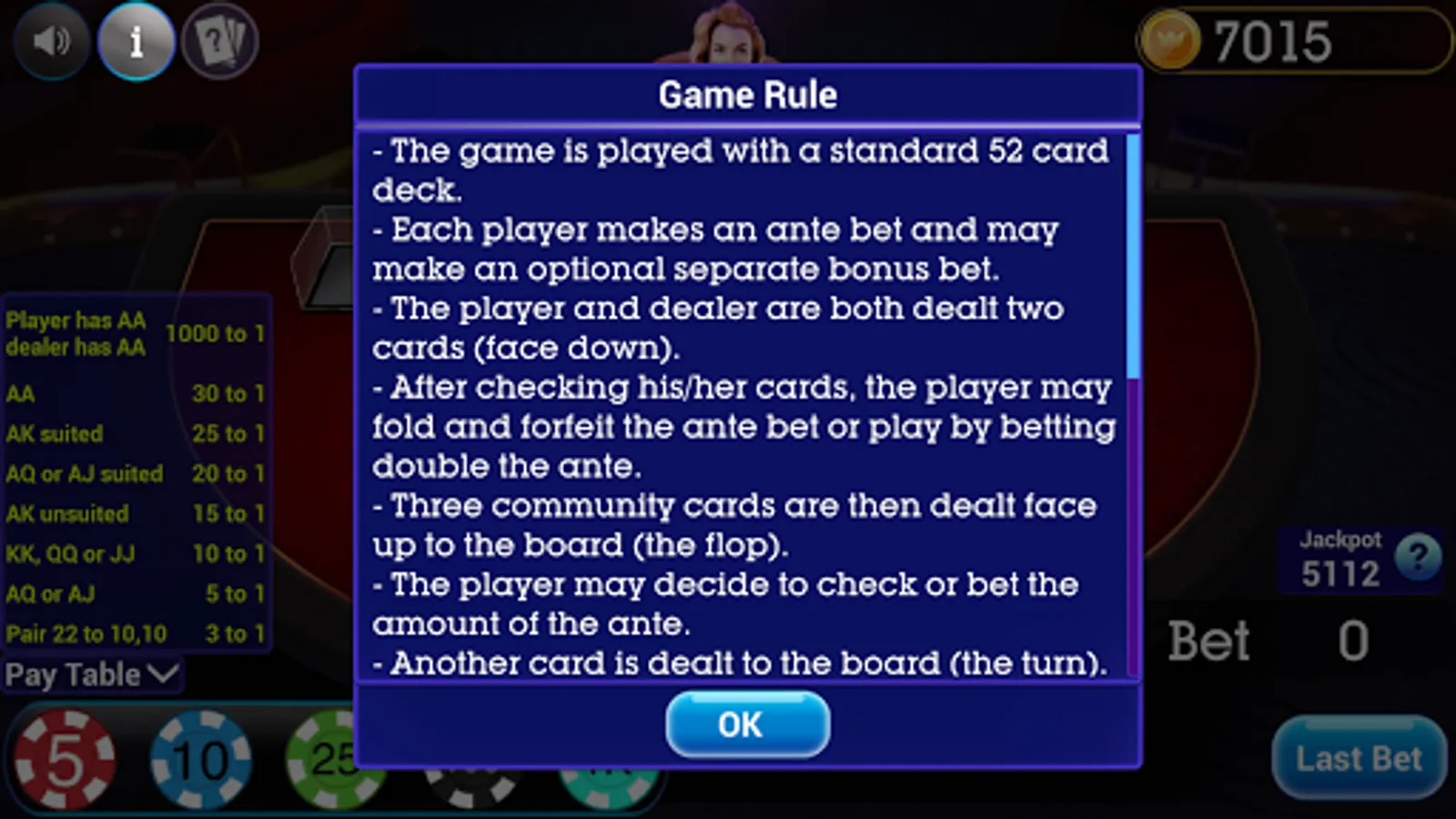 - If the player has the higher hand the Flop, Turn, and River bets will pay even money. If the player has a straight or higher the Ante bet will also pay even money, otherwise it will push.