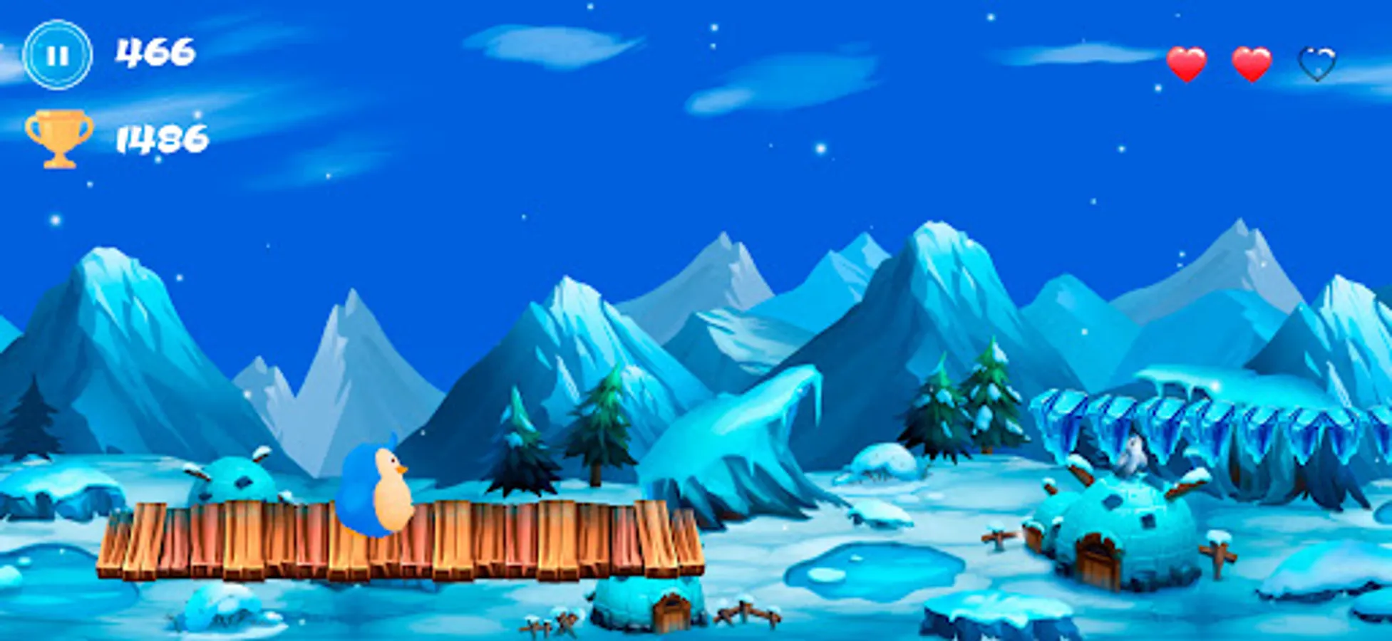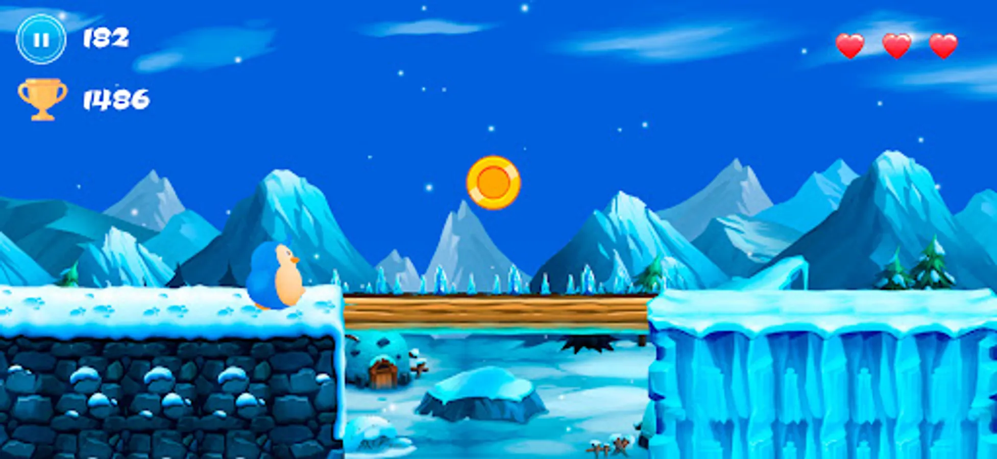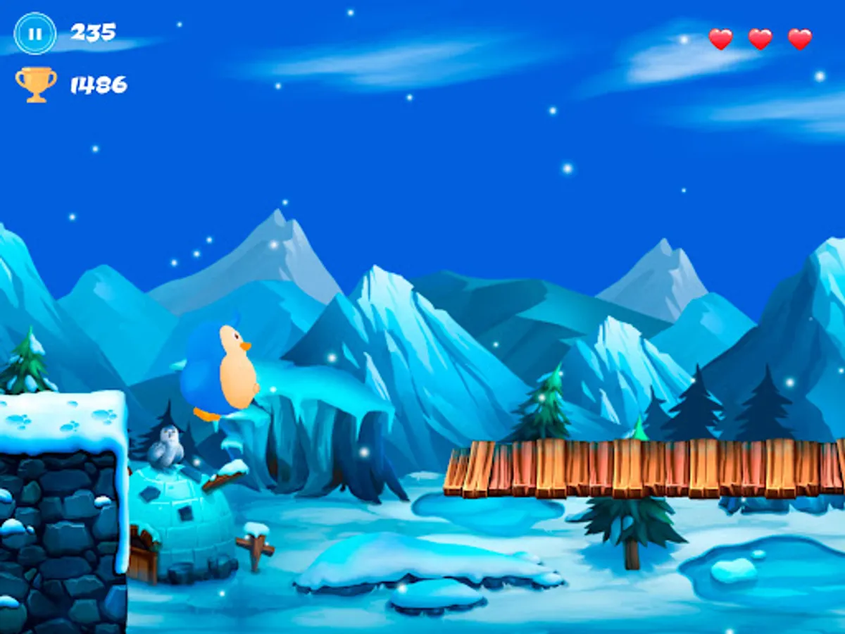 ❄️ Ice world: It's snowing and you're a cute penguin who has to run across the icy platforms while dodging spike traps, enemies like snowmen and flying bugs.