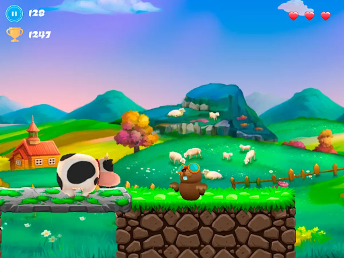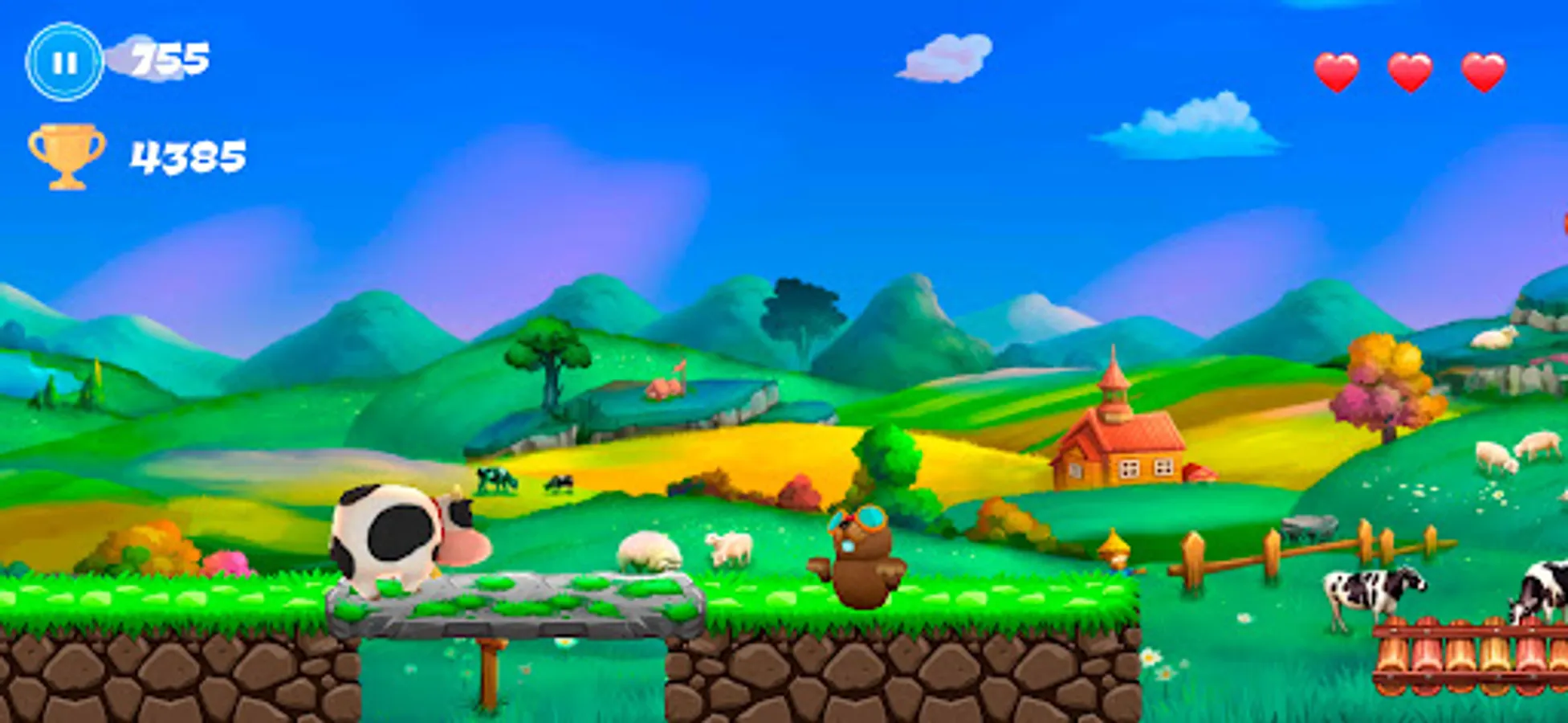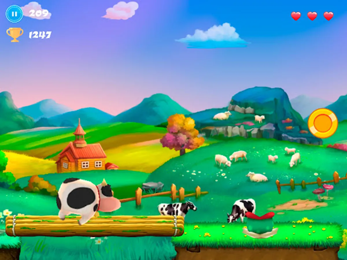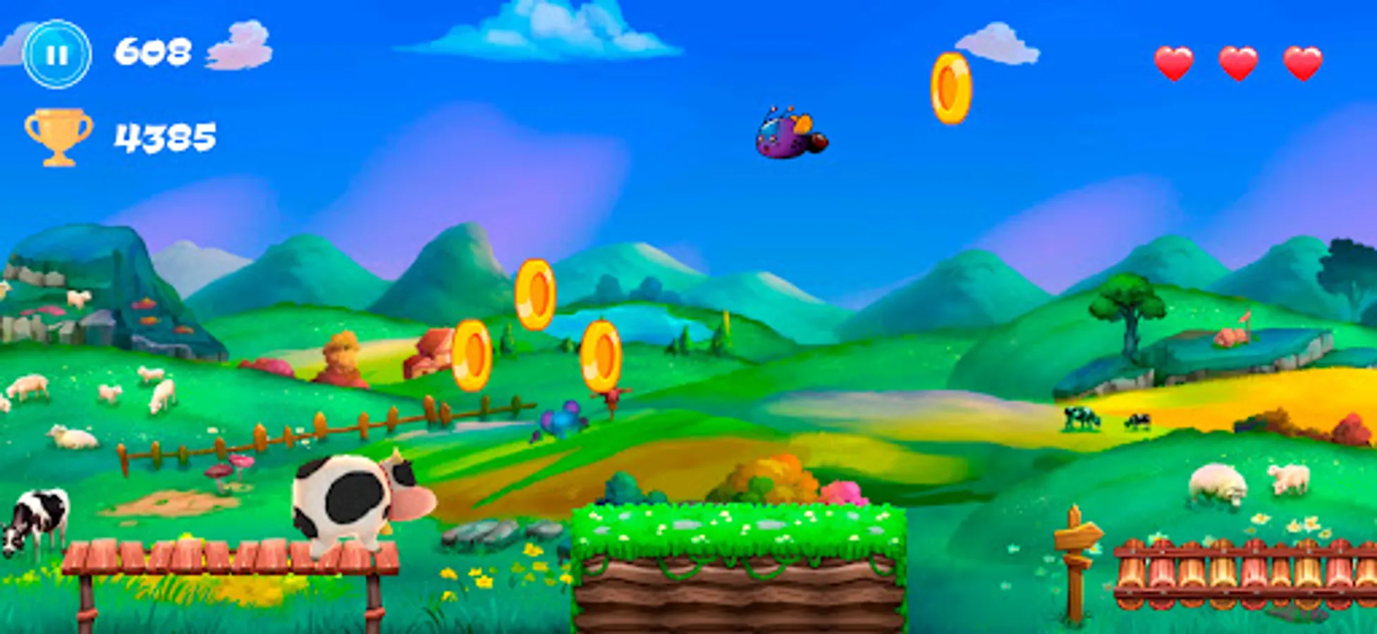 🐄 Farm: a beautiful world with a cow that has to run and jump on wooden platforms, avoid many traps and enemies like moles, bees...