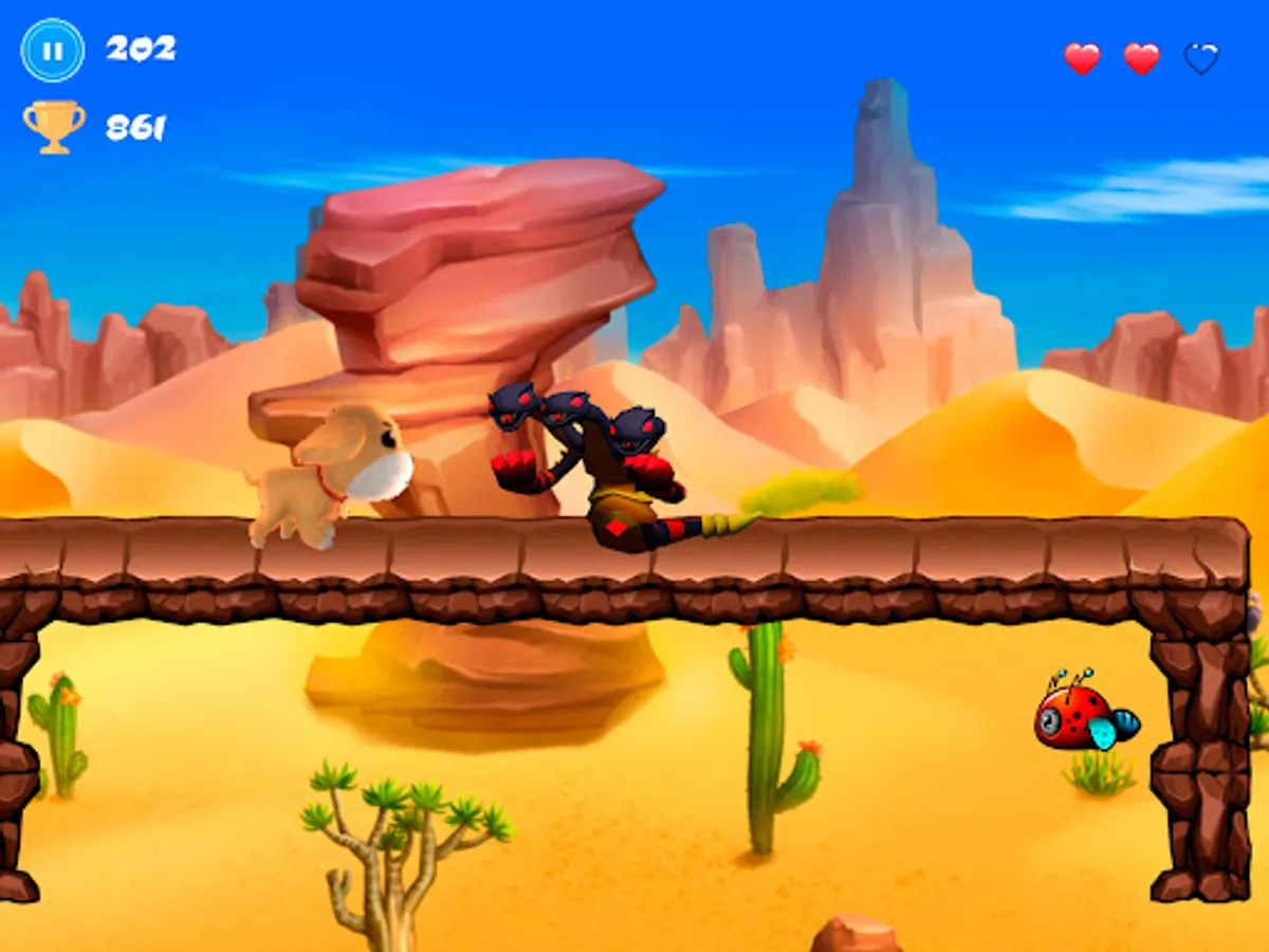 The operation of this endless runner game is very simple: you have to help the pet to avoid the enemies, jump on the platforms avoiding falling into the void and collect the objects that will allow you to get a higher score and power-ups such as the invincibility.